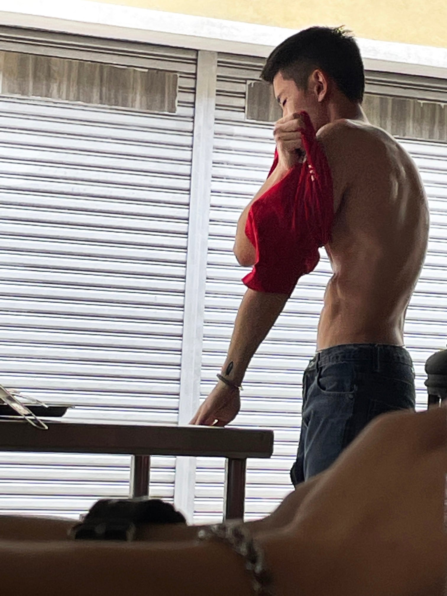 ▼ 可能是因为天气太热所以型男就想要脱下上衣擦擦汗?(反正这不是重点啦!)