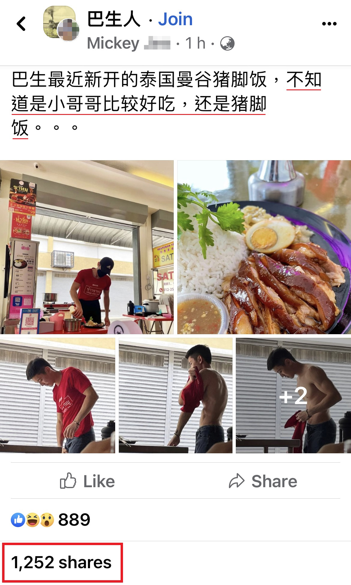 没错!一名网友今天在脸书群“巴生人”上传一系列照片,最近在巴生有一家新开张的猪脚饭档口,卖饭的竟然是个肌肉型男!照片立刻引起热烈反应,短短1小时内分享次数就破千!