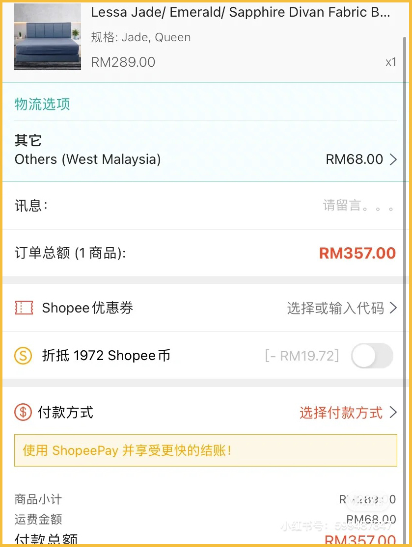 床架 RM289,邮费 RM68,买到来没超过RM360!