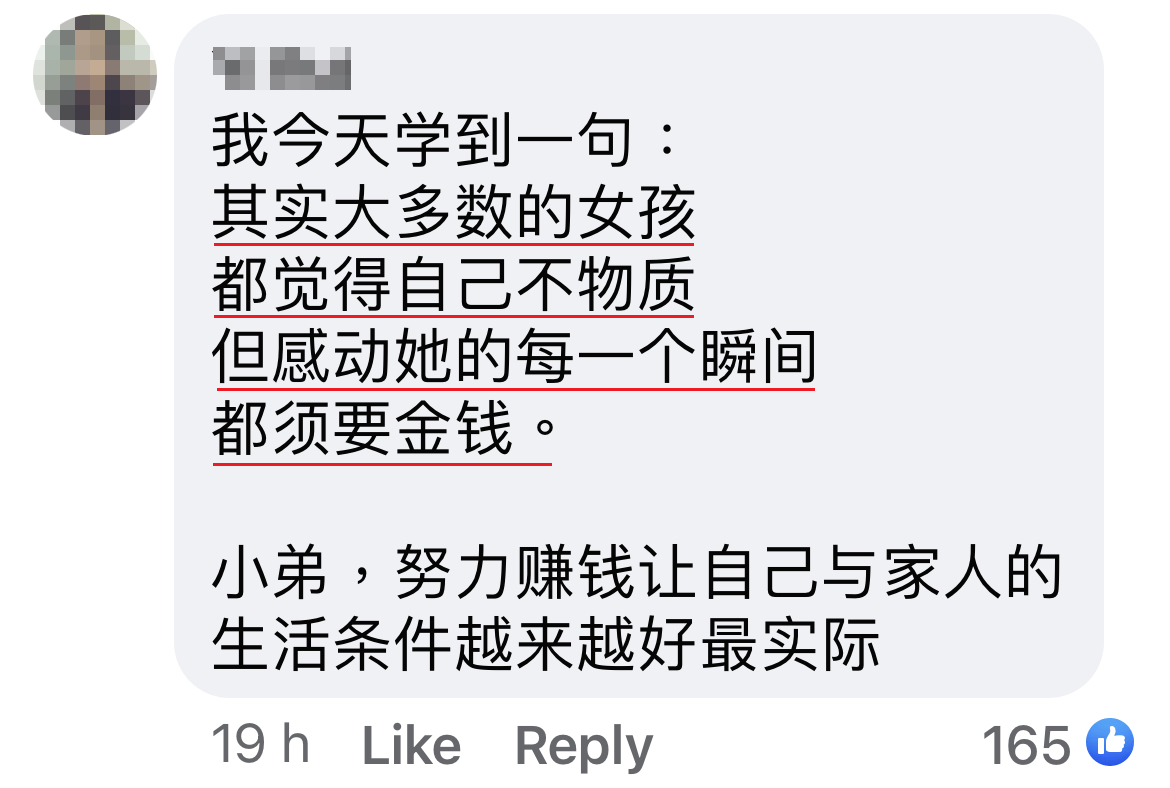 自从她上班后的不久,整个人就变得不一样,性格以及态度很大变化,而且时常会提起要求些贵重物品,一个小的包包都要整千块… 我就说:「买RM200-300的就好啦!」她会发很大脾气而且很难哄得回,到最后我还是买了给她。