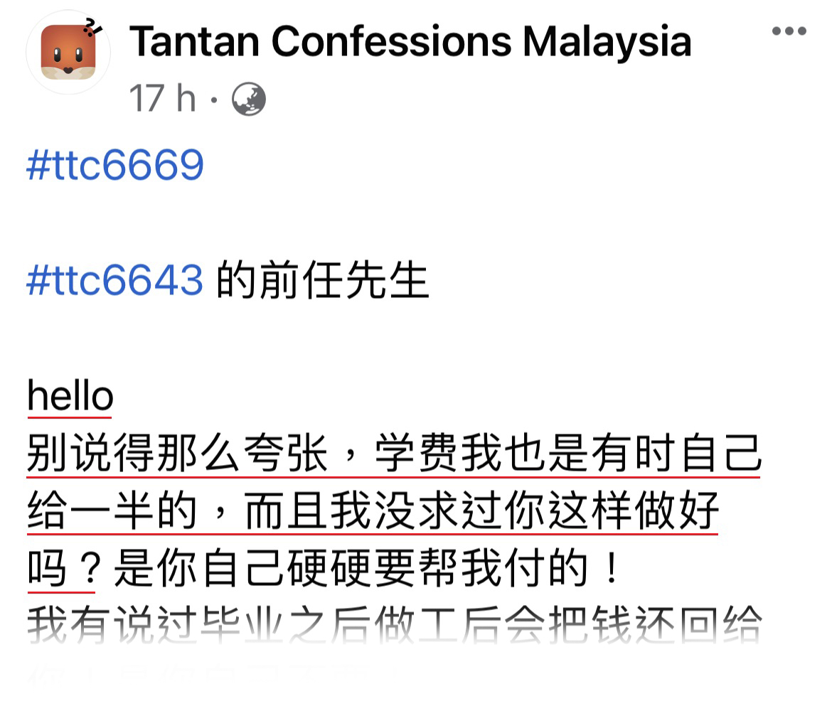Hello!别说得那么夸张,学费我也是有时自己给一半的,而且我没求过你这样做好吗?是你自己硬硬要帮我付的!