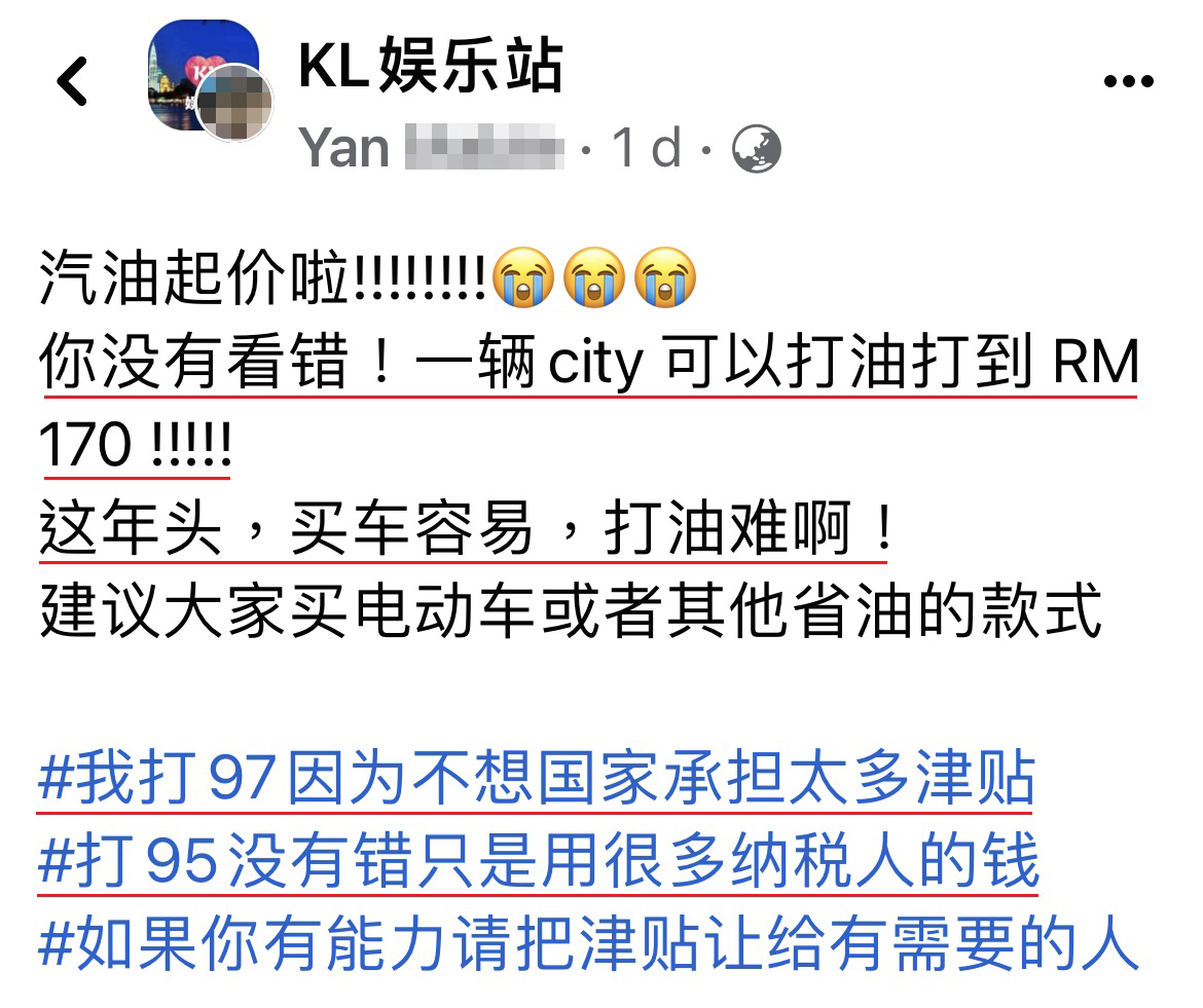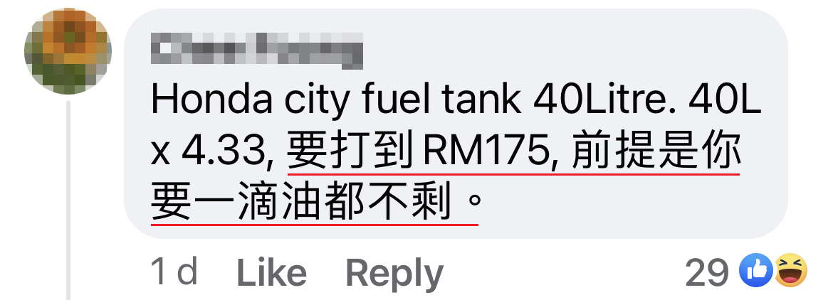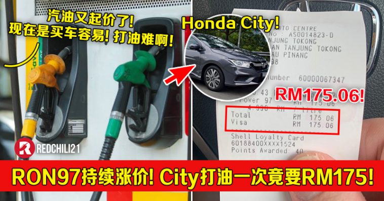 一名 Honda City 车主日前在“KL娱乐站”抱怨,去油站打满油竟然就花了RM175!让他忍不住吐槽:「这年头是买车容易,打油难啊!」