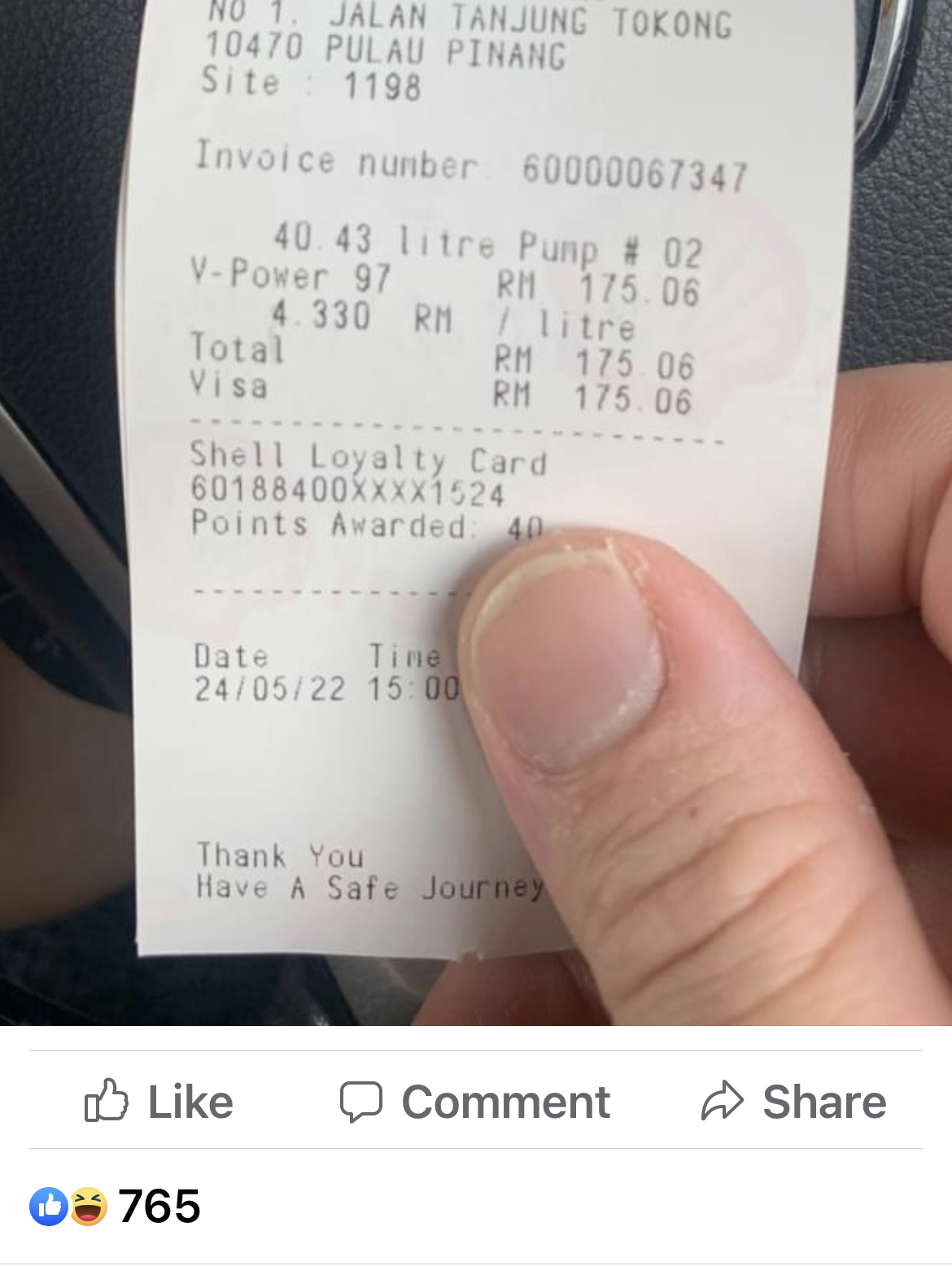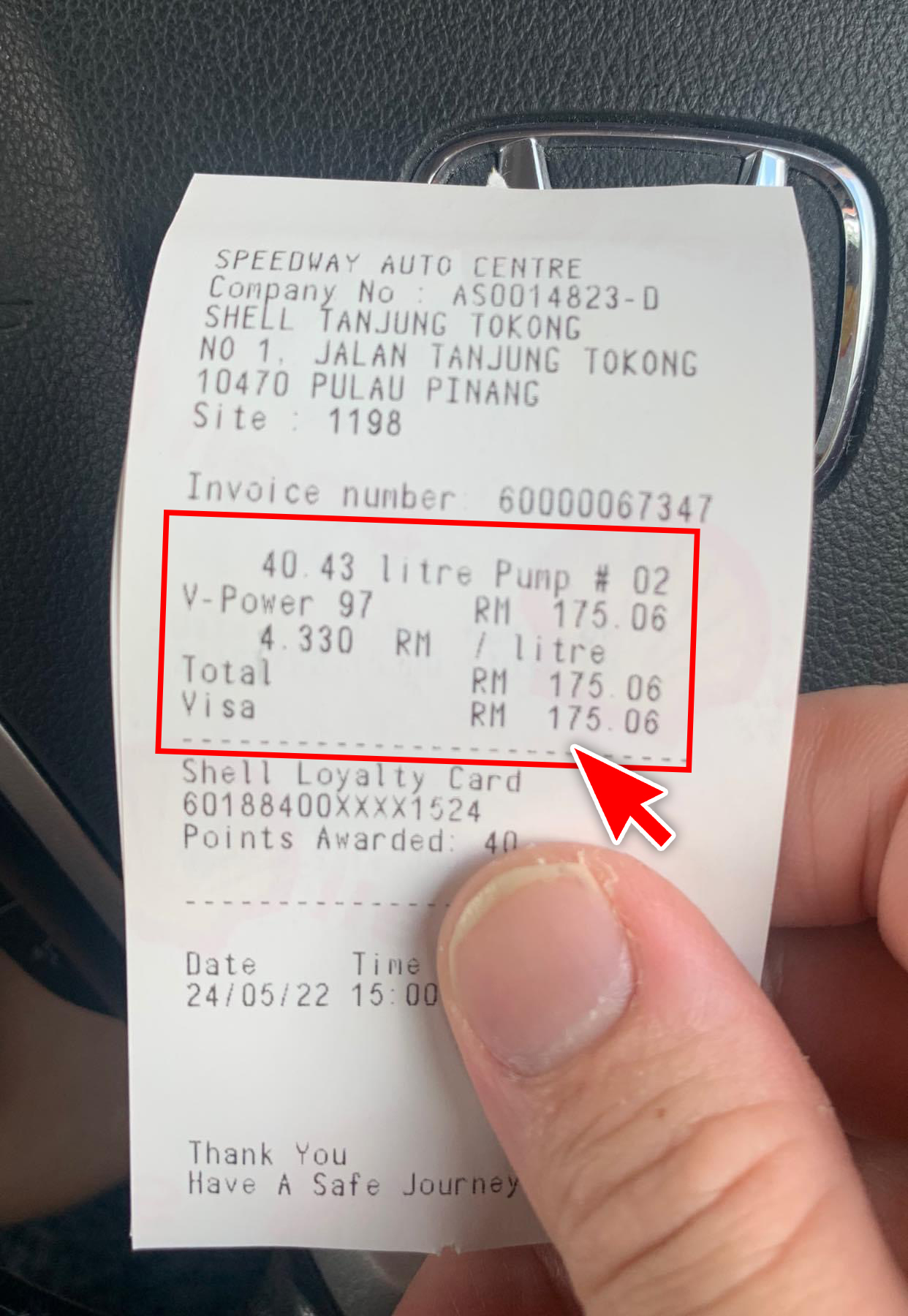 ▼ 从照片中的单据可以看到,5月24日当天下午,该名车主在槟城的一家 Shell 分行给 Honda City 打了40.43公升的 RON97汽油,付款的总金额是RM175.06。