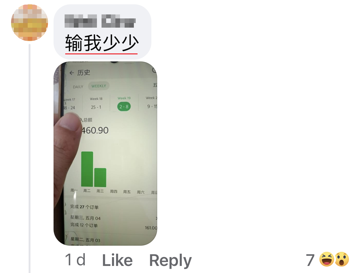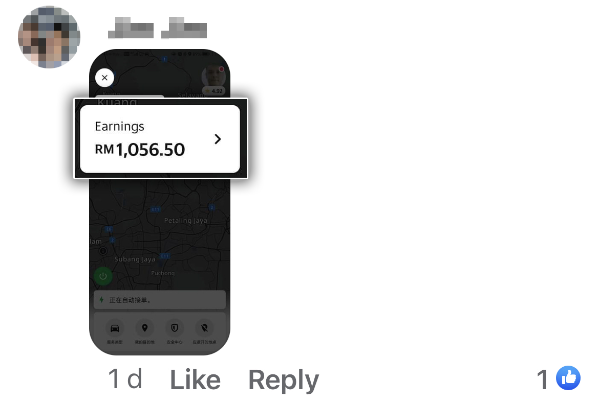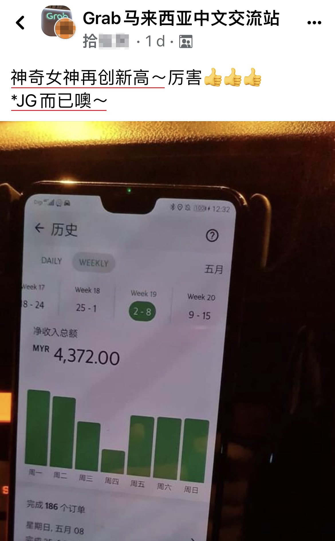 近日大马一名 Grab 女司机在群组晒出她在过去一个星期的净收入,只是一般的 JustGrab 竟然就赚了RM4,400这么多!不是一个月,是一个星期而已!(月入过万不是梦~)