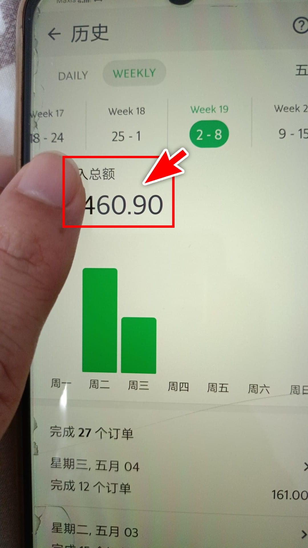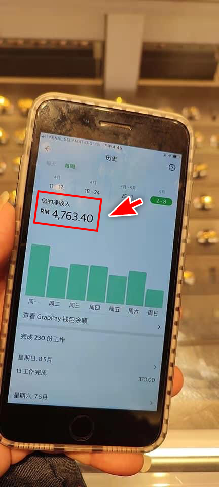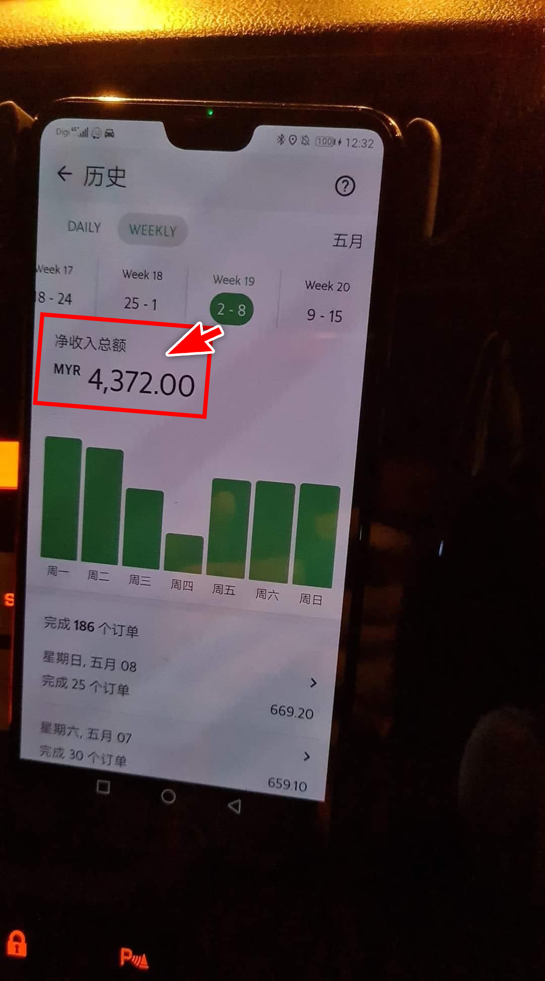 ▼ 照片中的手机显示该名 Grab 女司机在开斋节期间所赚取的收入,5月2日至8日这7天内她的净收入总额是RM4,372.00!