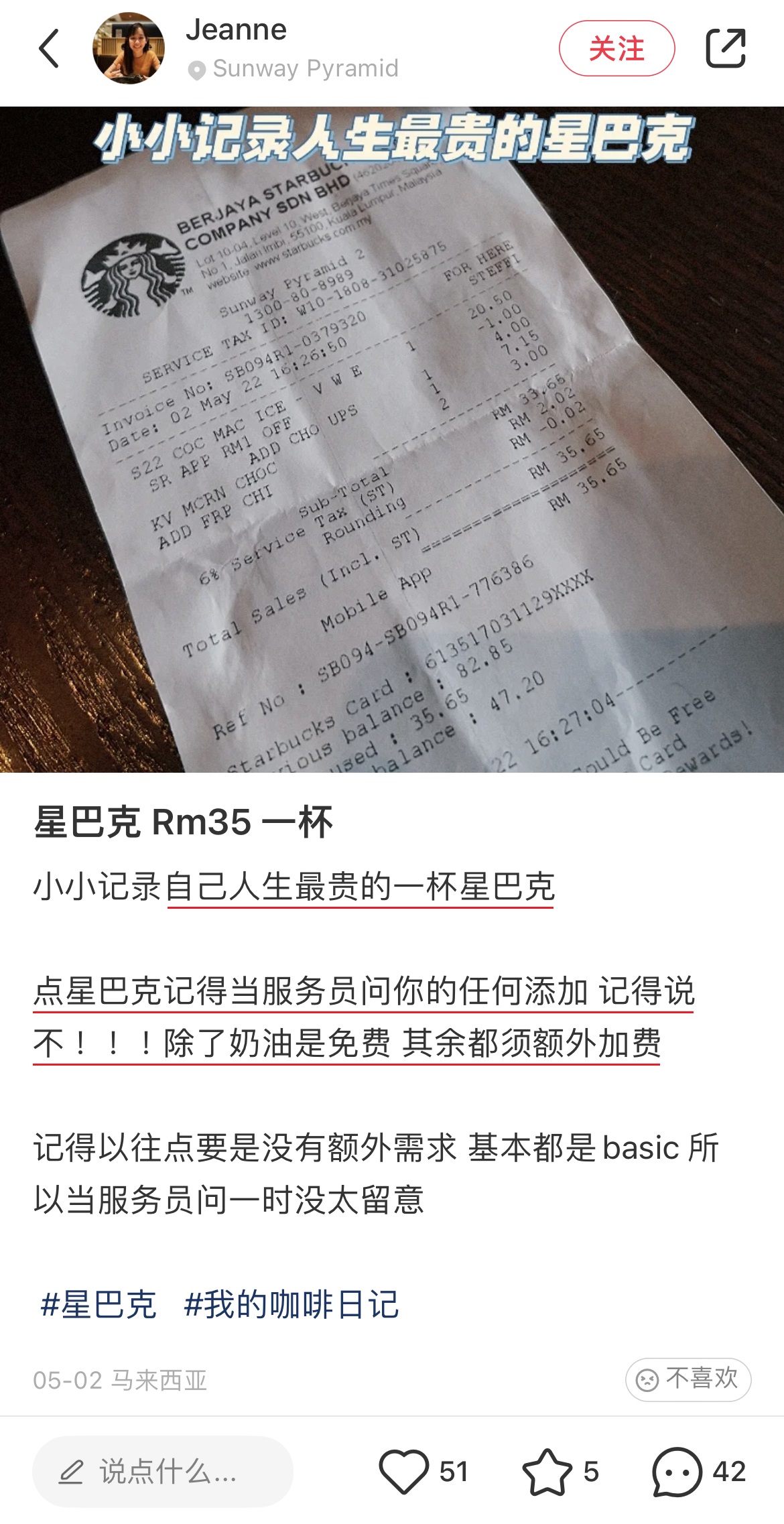 就像这名大马小红书博主近日在吉隆坡一家星巴克分行购买饮料,在柜台 order 的时候一个不留意就加了各式各样不便宜的 Add-on Topping,最后结账看到价钱吓很大,这一杯饮料RM35!!