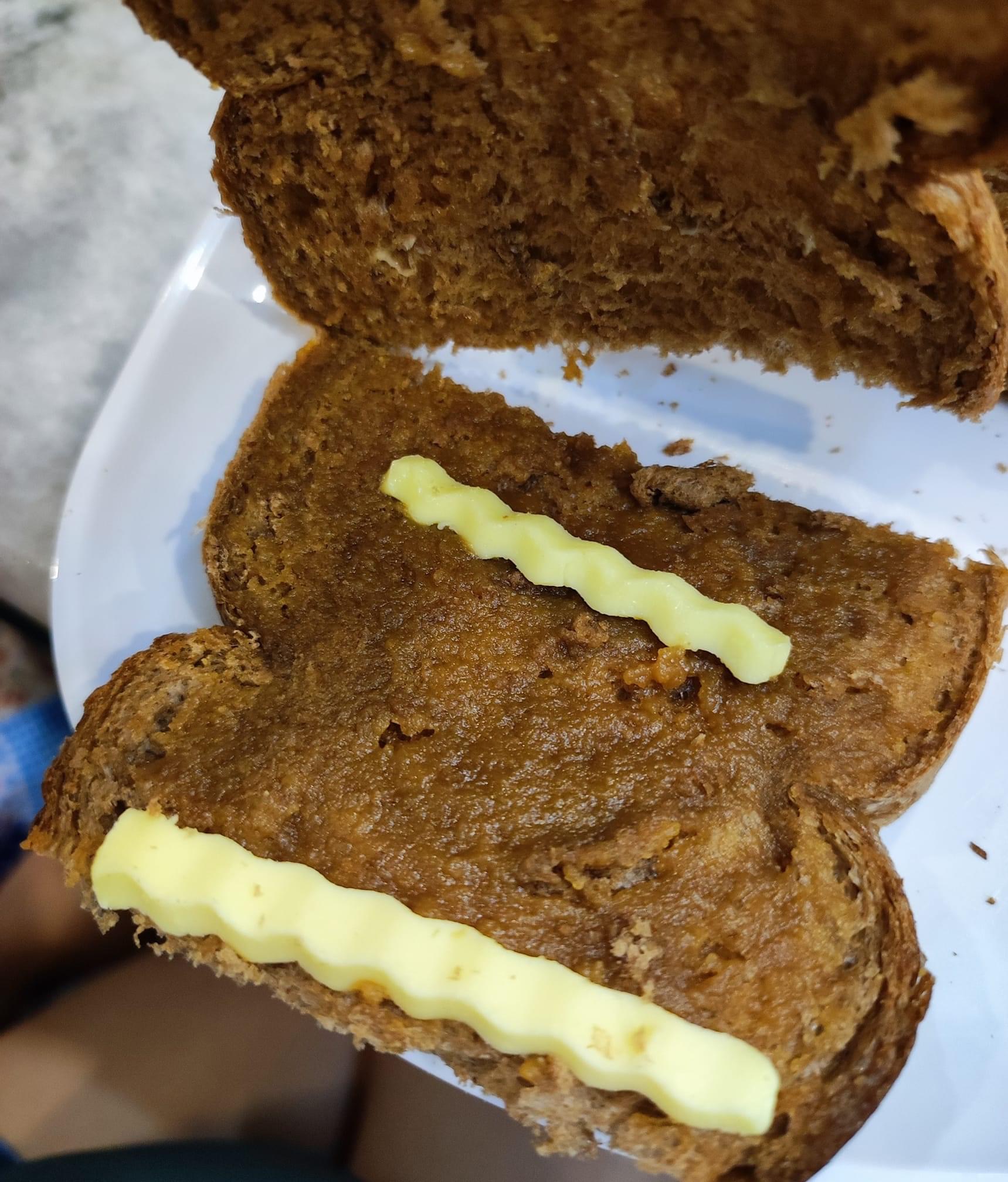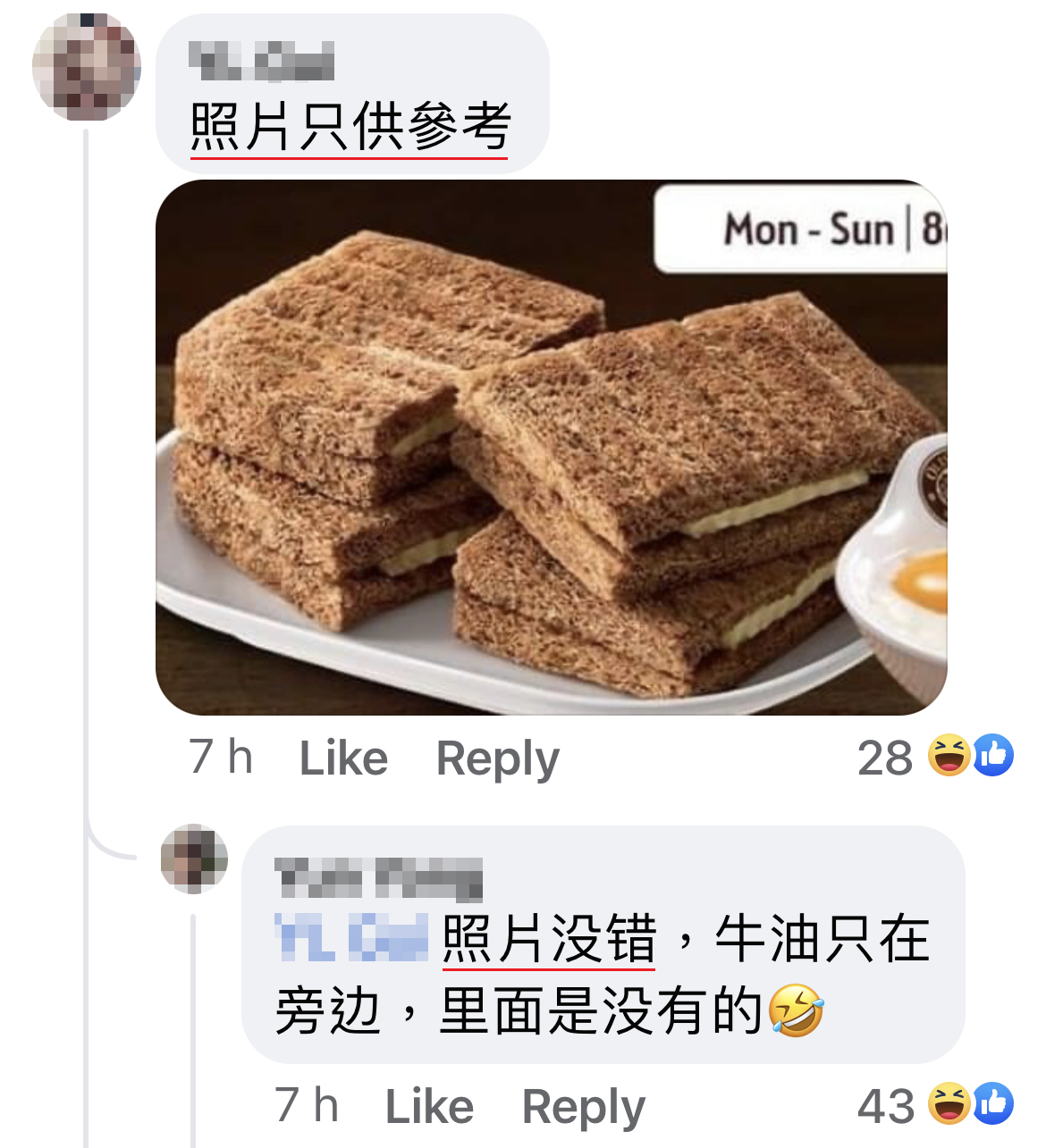 ▼ 按照菜单照片显示,烤面包的两边应该是厚厚的牛油,中间则是满满的 Kaya 酱。但据网友们分享,以前的牛油是一片的。