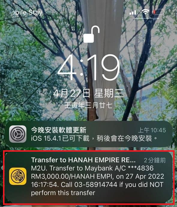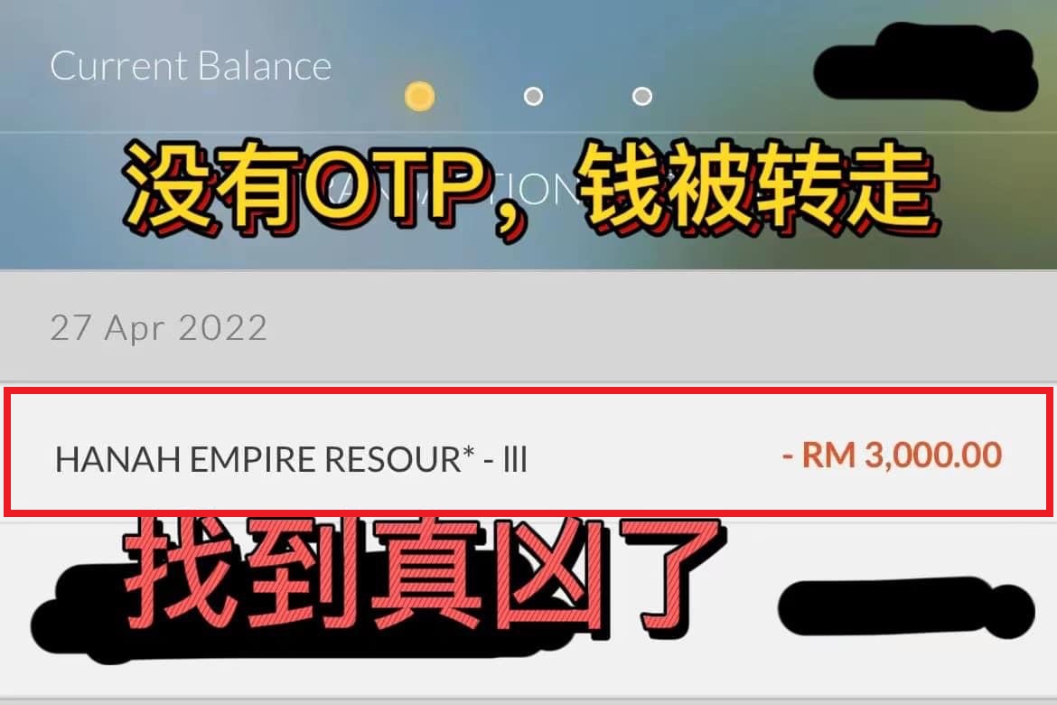 2022年4月27号:我的钱又被转走了。完全没有收到 OTP 没有任何信息的情况下直接被转掉。因为我之后收到来自 App 的通知,告诉我该银行被转了RM3000,才发现钱早已被转走了。这个银行卡我没有怎么用的都是拿来进薪水而已。