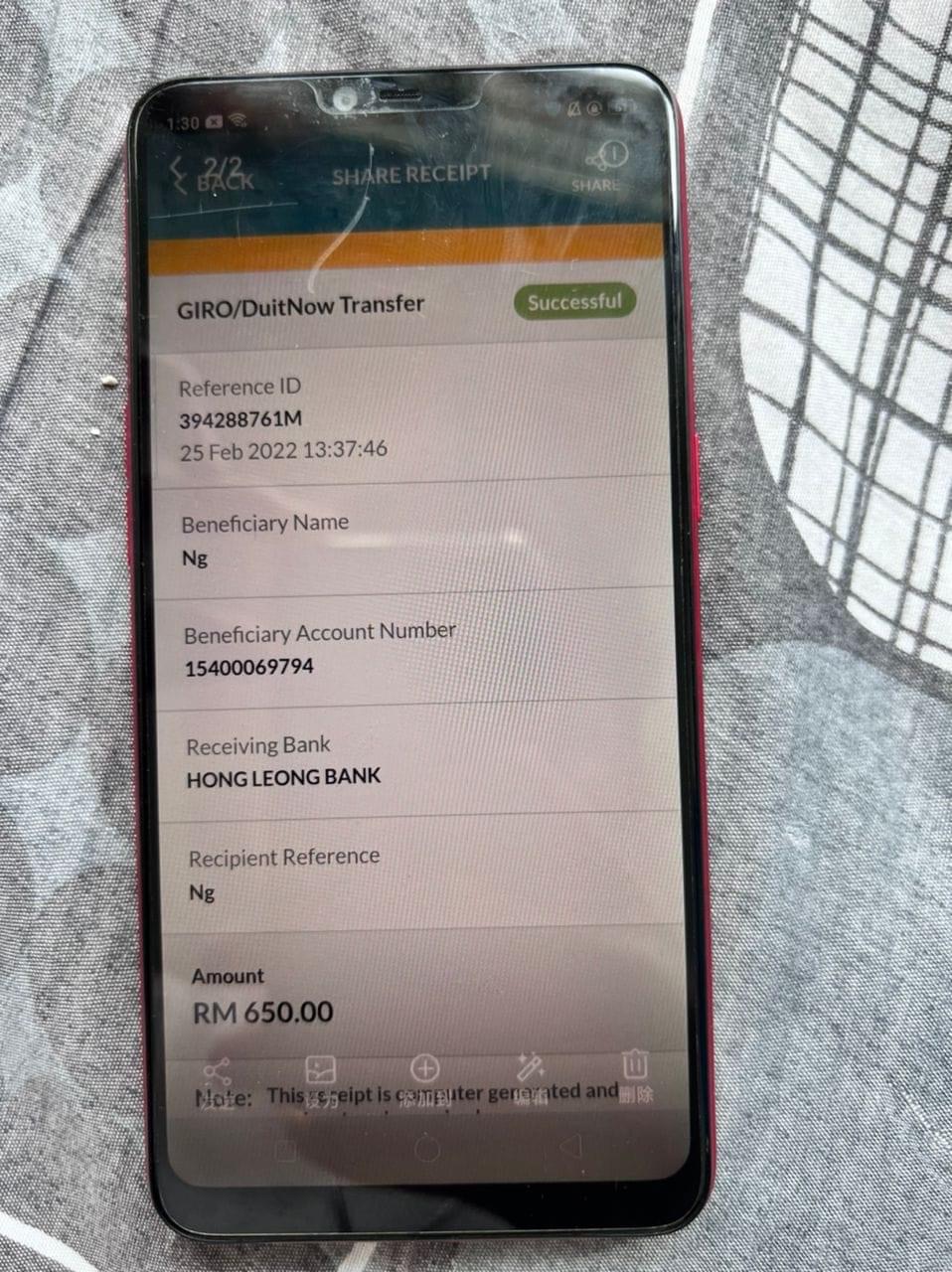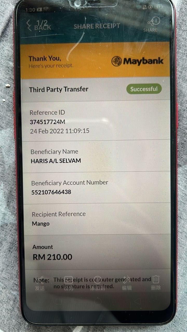 结果我没有想到2月,又有一个室友整整RM6k被转走了。那时候我猜到是他,但是没有证据也不想冤枉好人,就自己小心一点就好了。