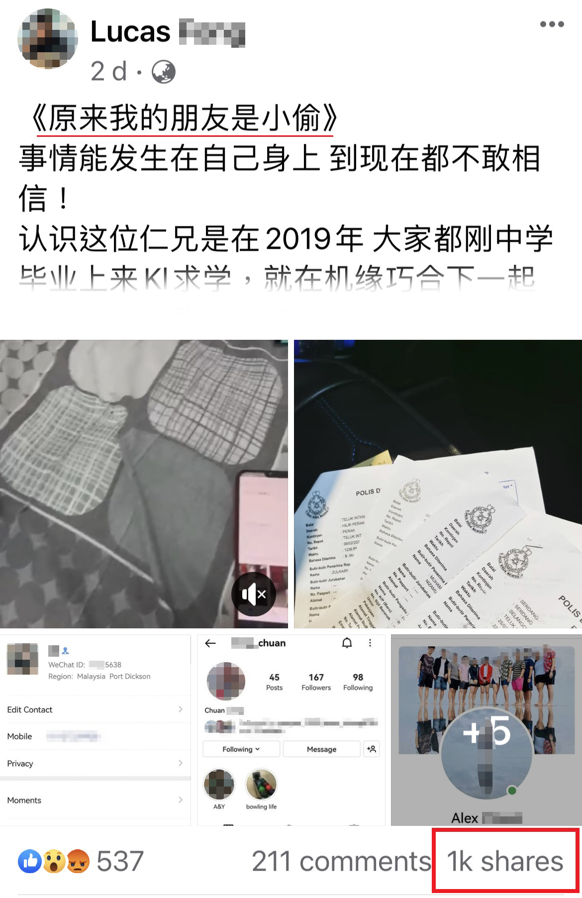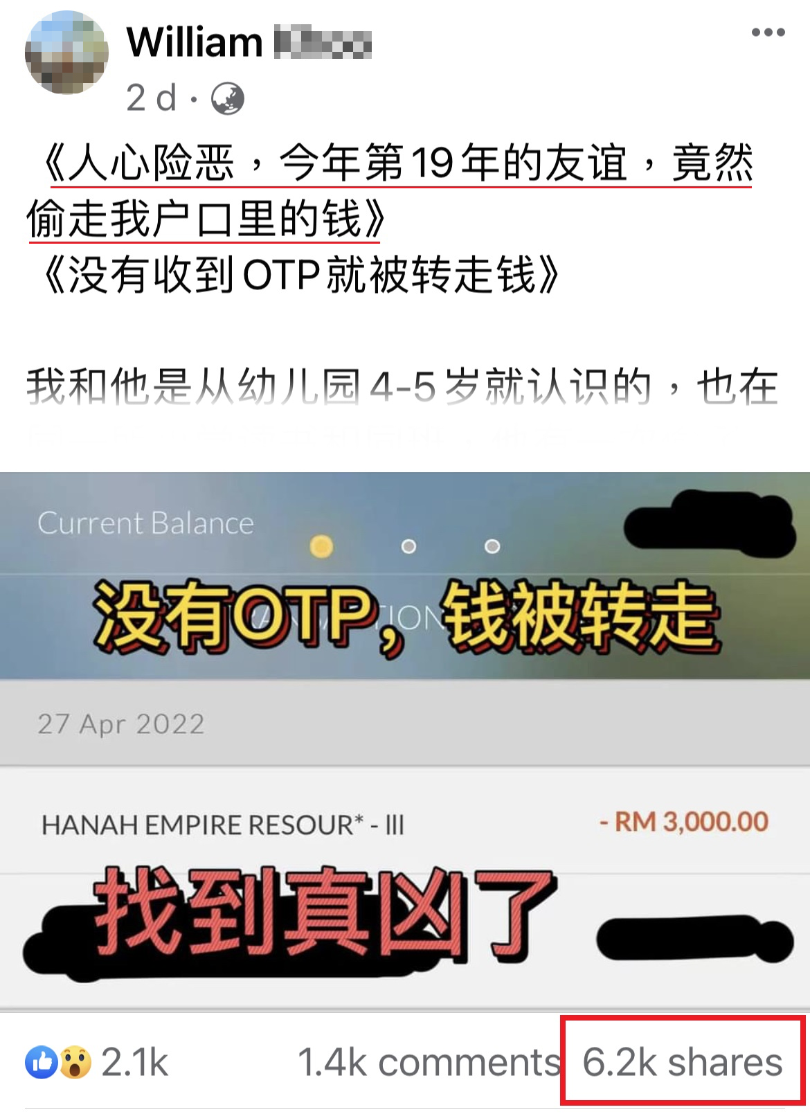 可是他的态度和行为是没有感觉任何惭愧。我才决定把这个事情曝光出来,让大家接触到他的人真的要小心,我不知道他什么时候会再犯案。我不想再有受害者因为他而丢失钱财,真的提醒各位。他是我19年的朋友,为了RM4000来hack我的户口。