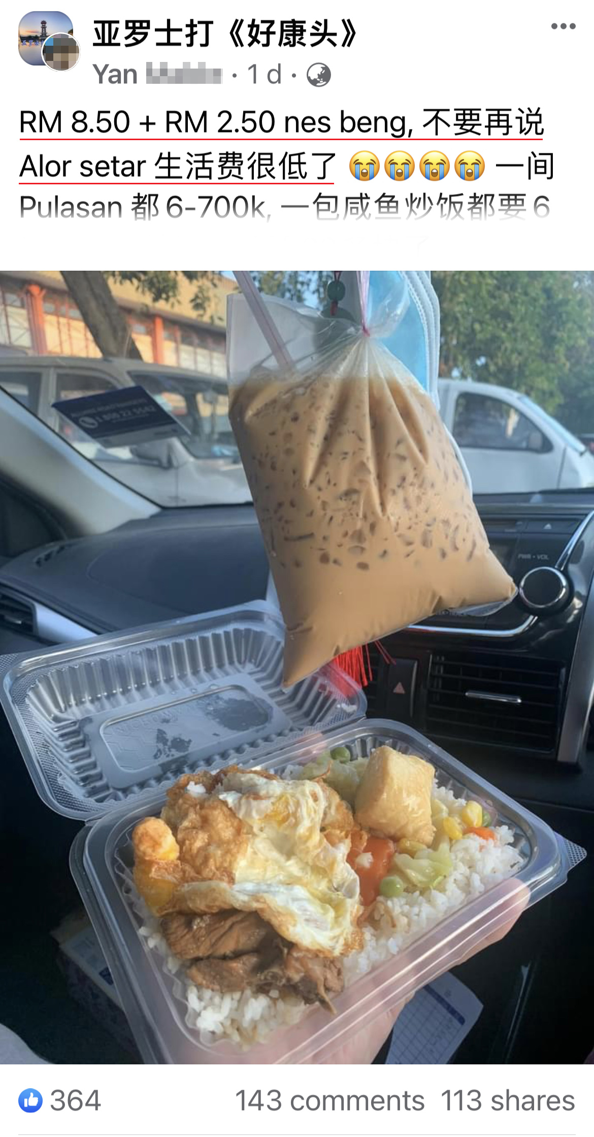 RM8.50 + RM2.50 Nes beng(Nescafe 冰)。不要再说 Alor Setar 生活费很低了,一间 Pulasan 都RM600K – RM700K,一包咸鱼炒饭都要RM6了,一粒汉堡都要RM20多了。