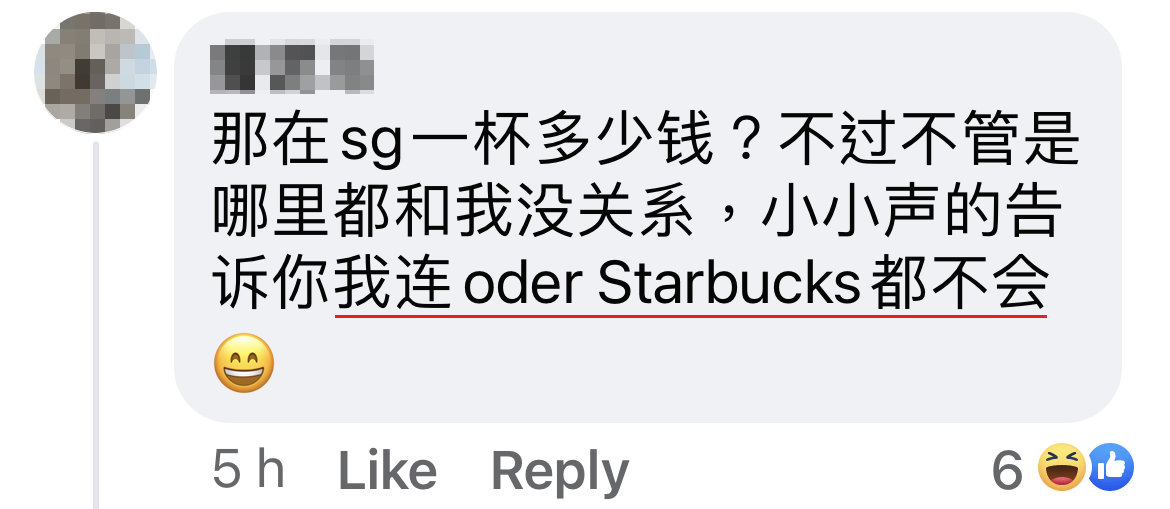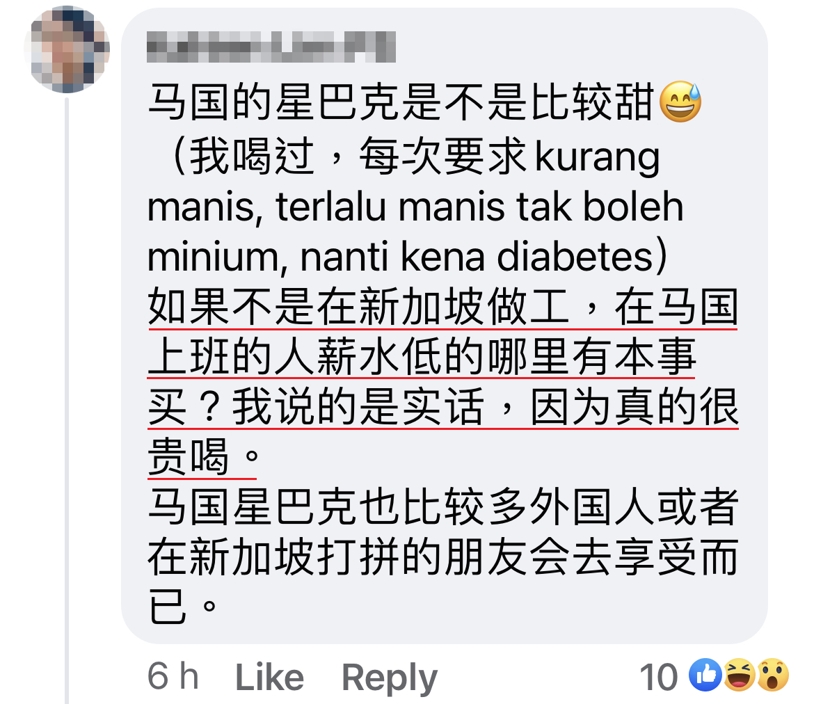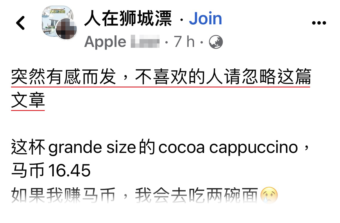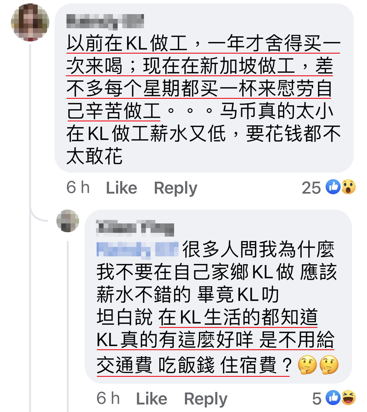 今天一名在新加坡工作的大马女子有感发文,同样的花费金额如果赚的是新币,就会舍得买一杯星巴克慰劳自己;但如果赚的是马币,就宁可用来买能够喂饱肚子的伙食。