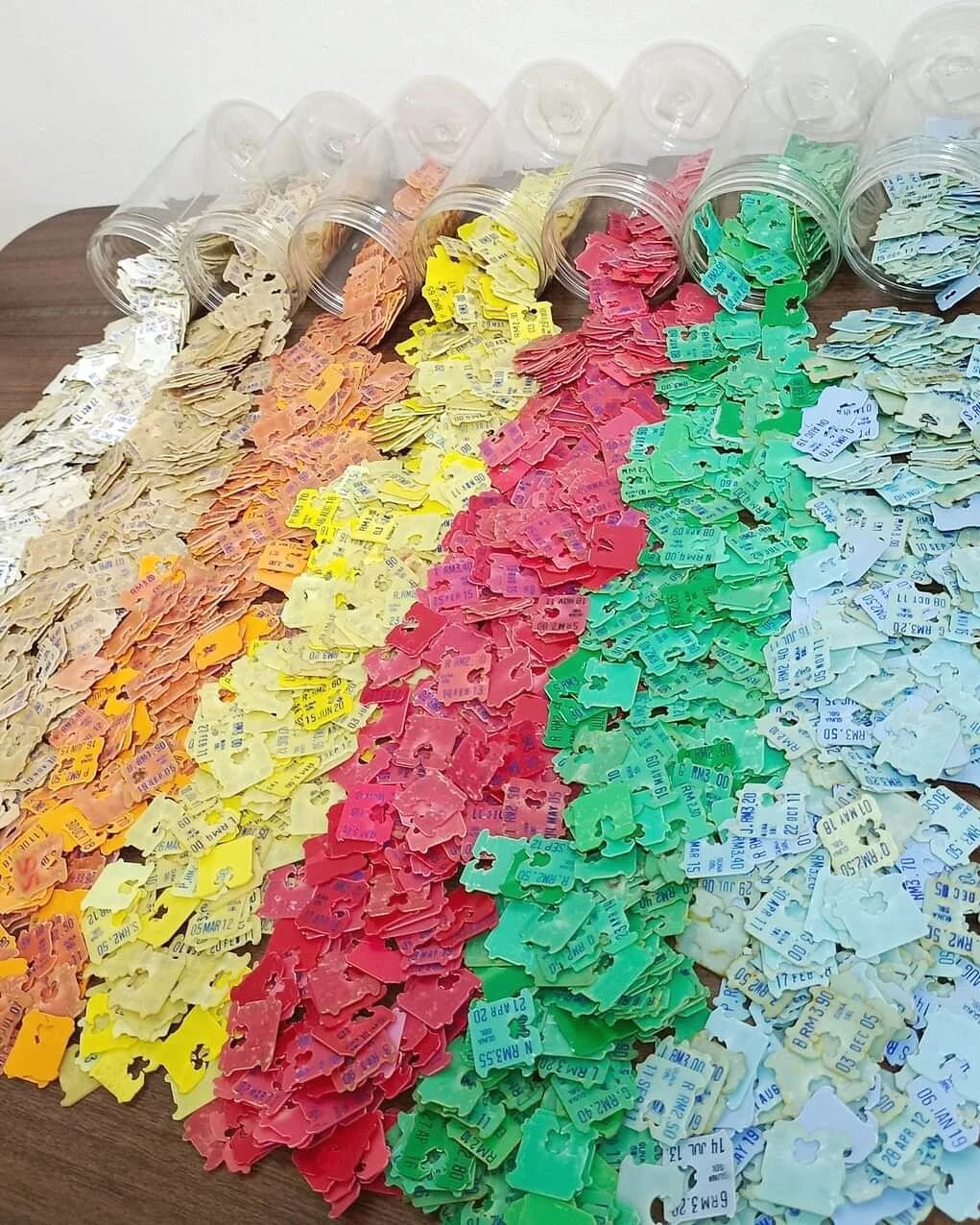一名大马女生日前在社交媒体晒出自己维持了18年之久的收集成果,一罐一罐颜色分类整齐的面包夹,超壮观!