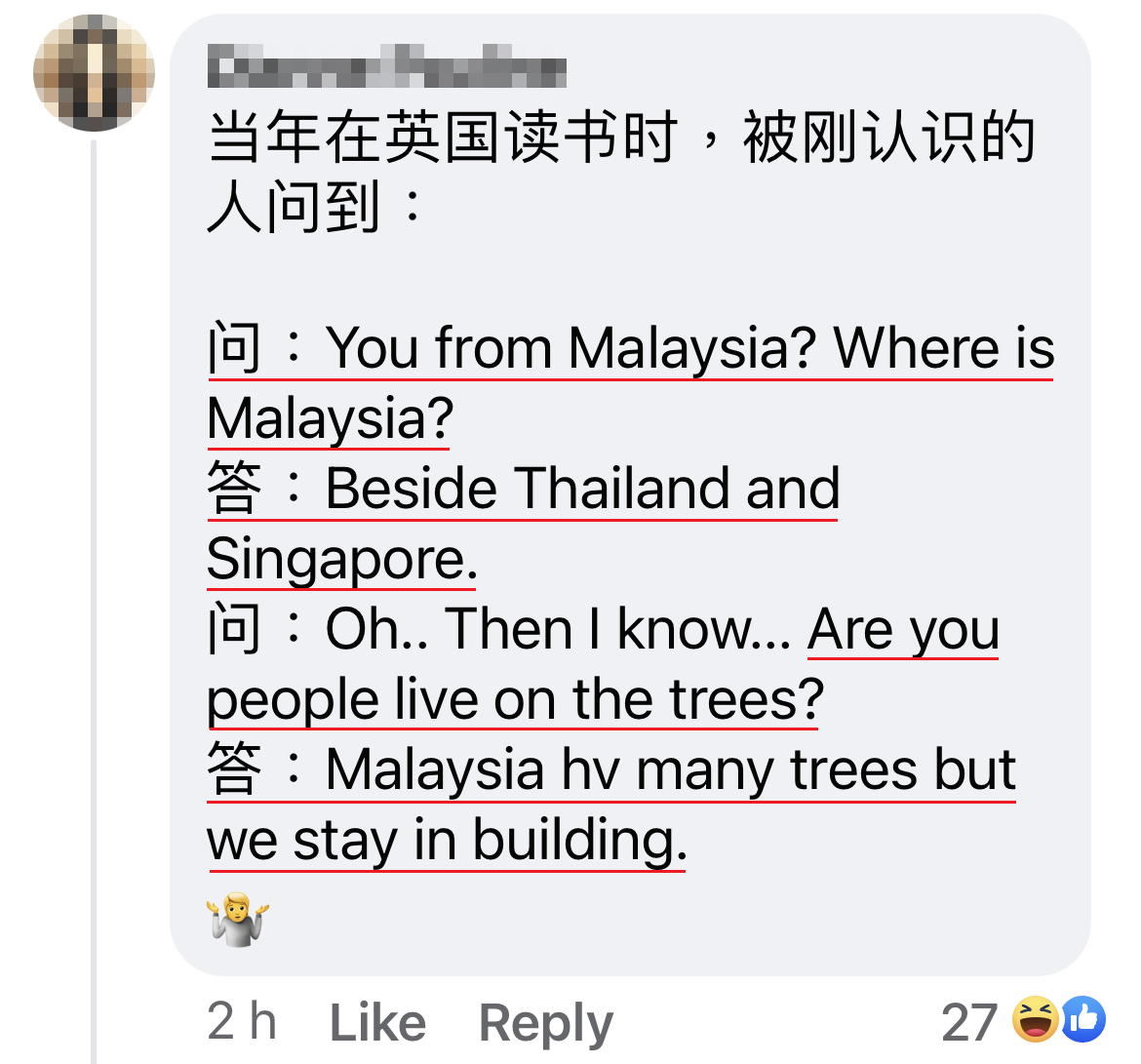 ▼「他们以为马来西亚人都住在树上的。」是认真的…