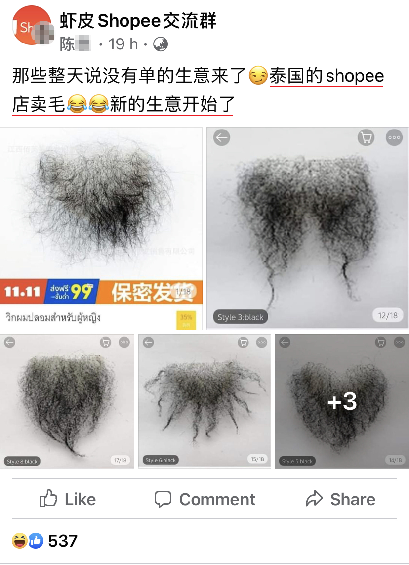 商机来了!Shopee竟然有人「卖毛」最贵RM168!网友:我今晚就去偷剃我老公的kalatai毛!