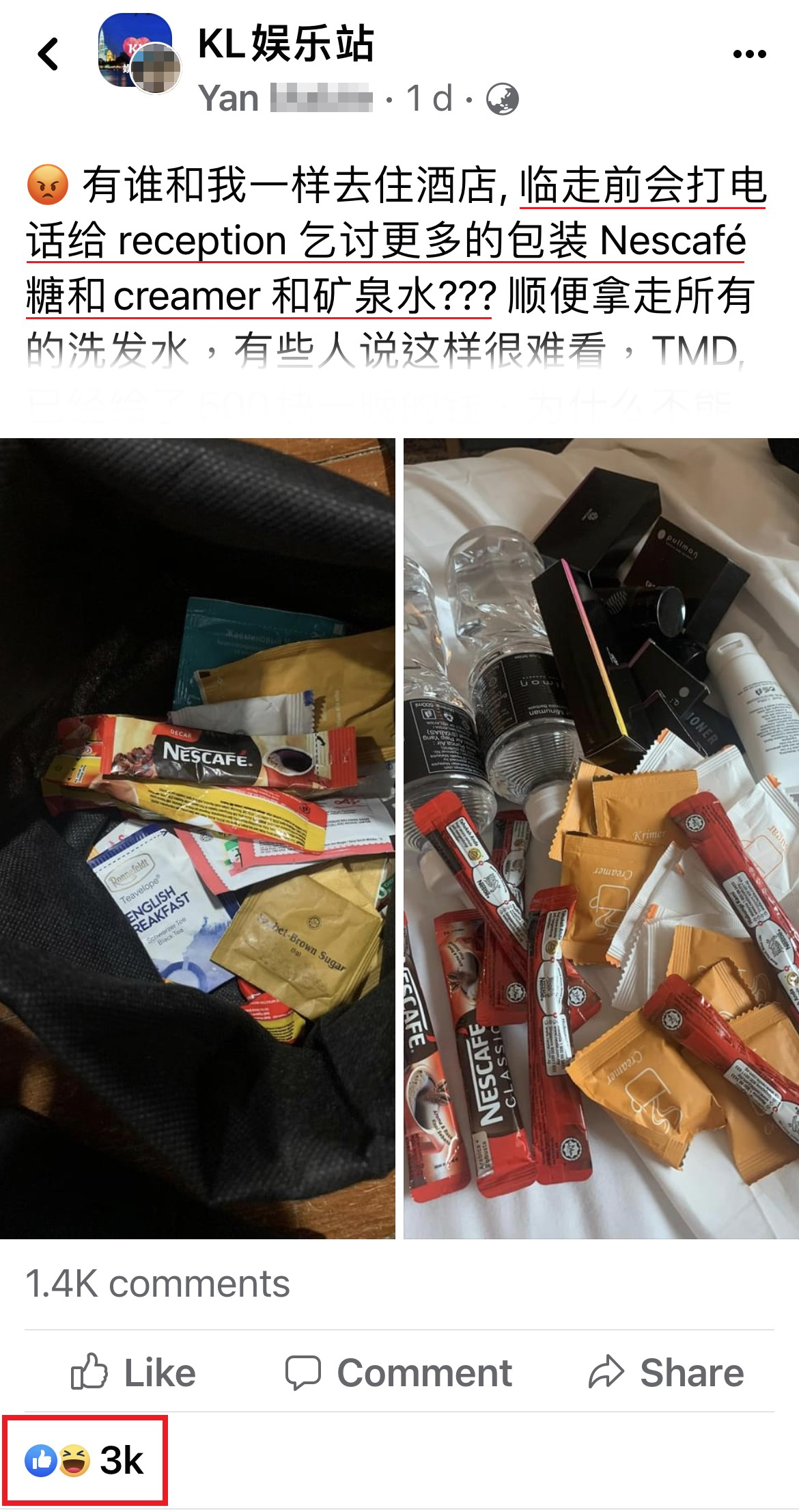 一名大马网友近日就PO文分享自己平时入住酒店的小习惯,离开之前不但会带走房间内的免费物品,还会打电话给接待处“乞求更多”!