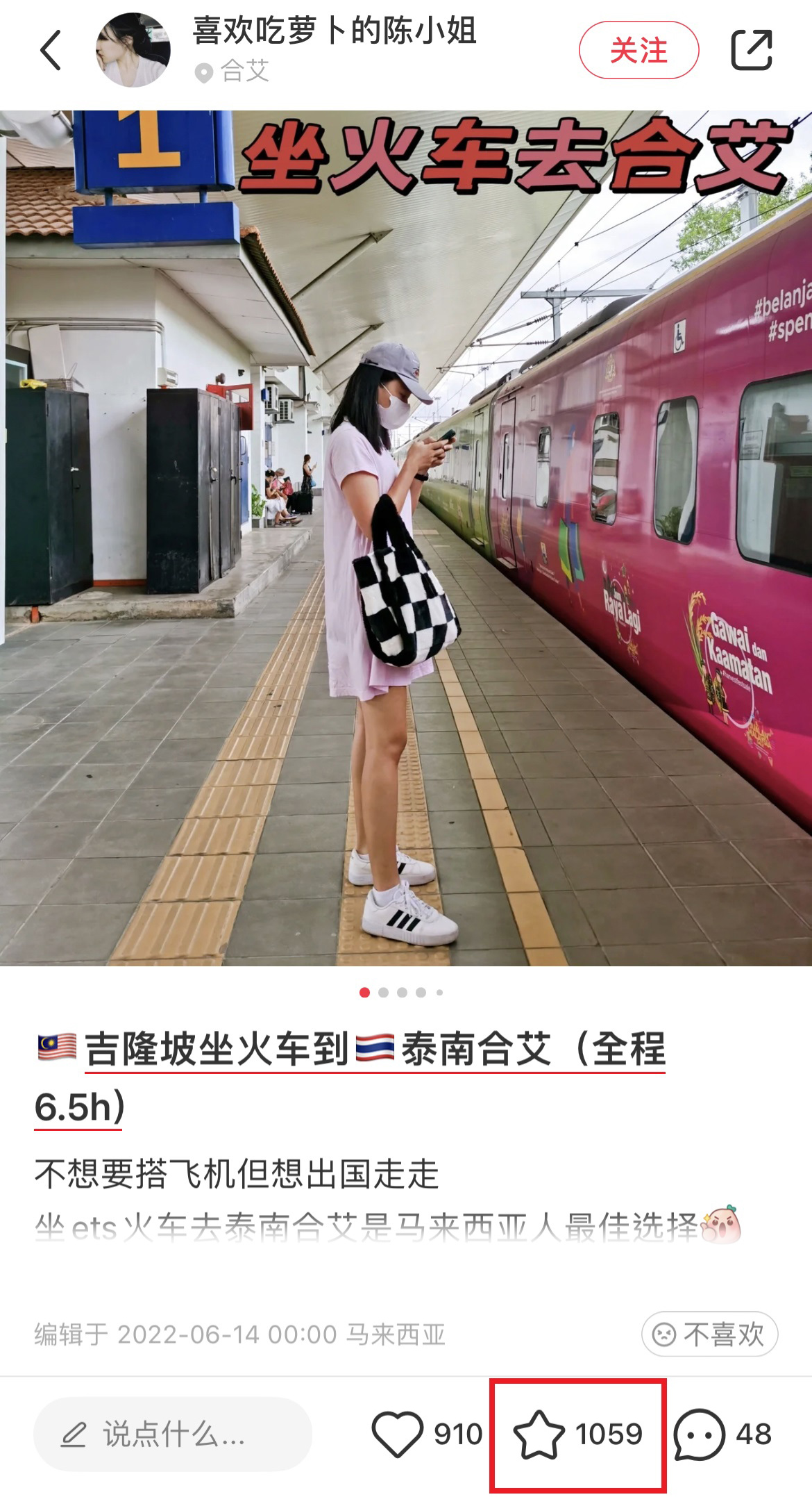 大马小红书博主“喜欢吃萝卜的陈小姐”近日从泰国回来以后,大方分享这一趟旅行的体验心得和评分推荐,原来“坐火车出国”是这么方便的!