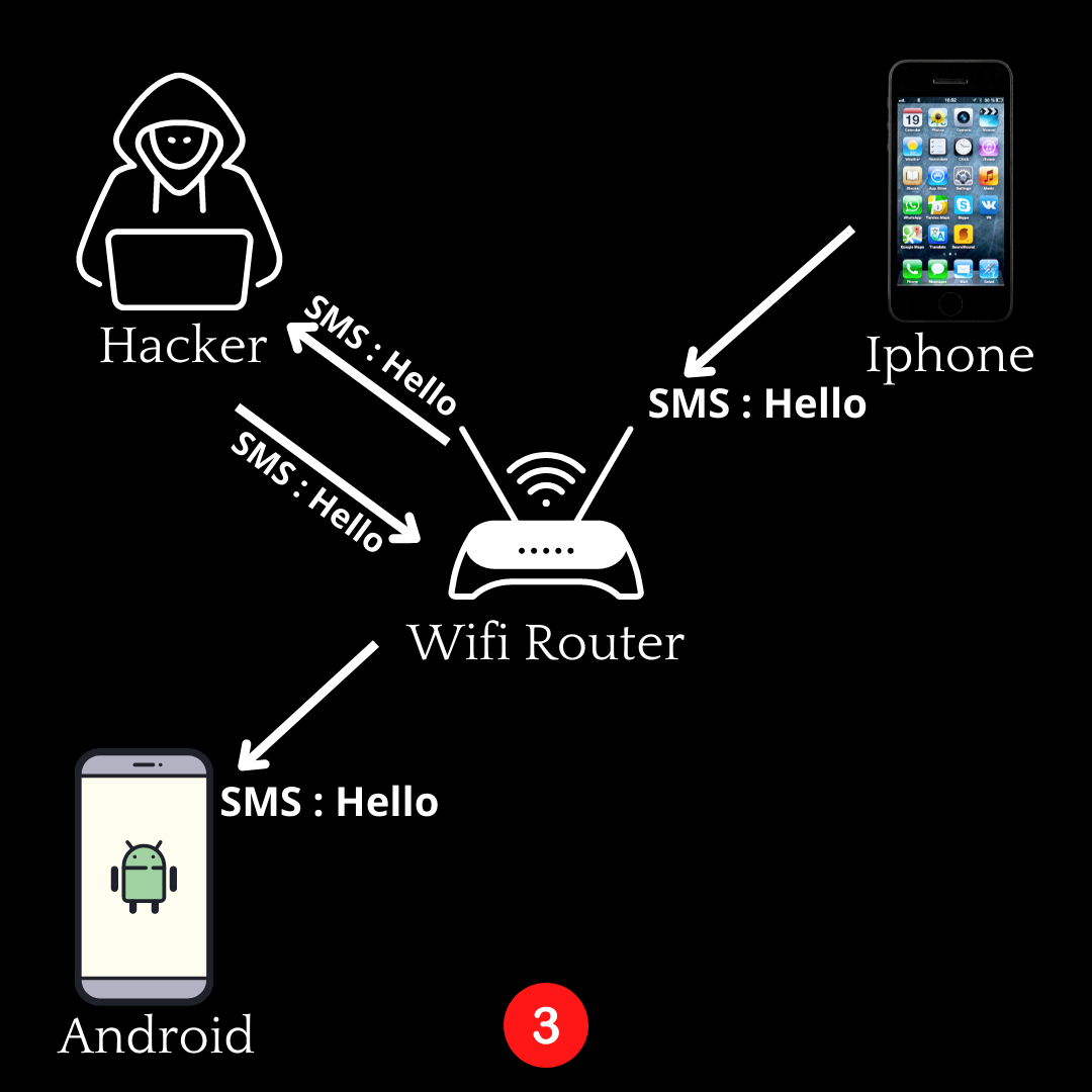 Router 把短信发到 hacker 电脑再转向转到去手机二号。这个过程是不会有任何的察觉,他们互相可以收到彼此在信息的。