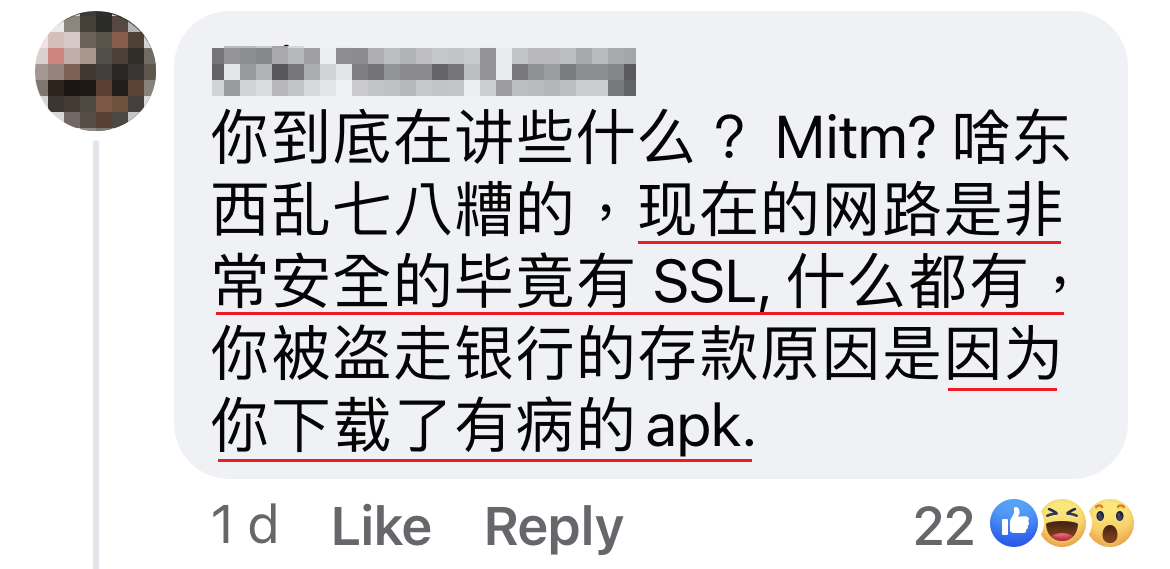 这几天就有很多案件说银行被盗。什么 link 都没按,什么 APK 都没有 download,无端端钱就不见。我不敢讲 hacker 的做法就是我现在要讲的,但是不排除这个可能性。
