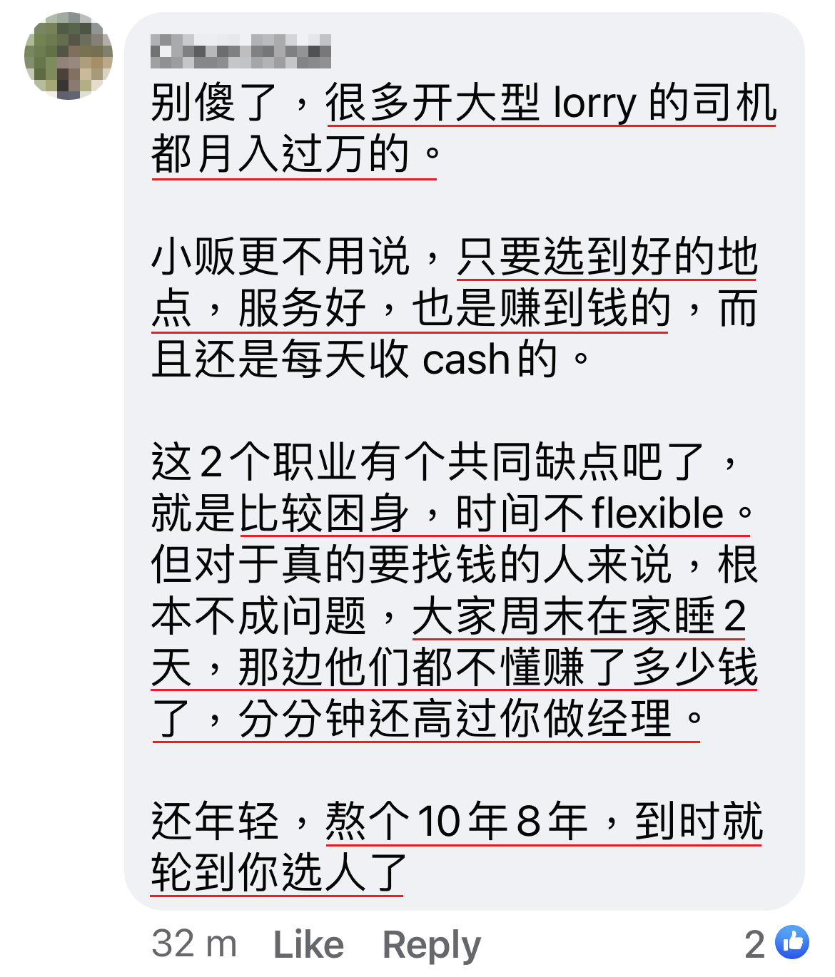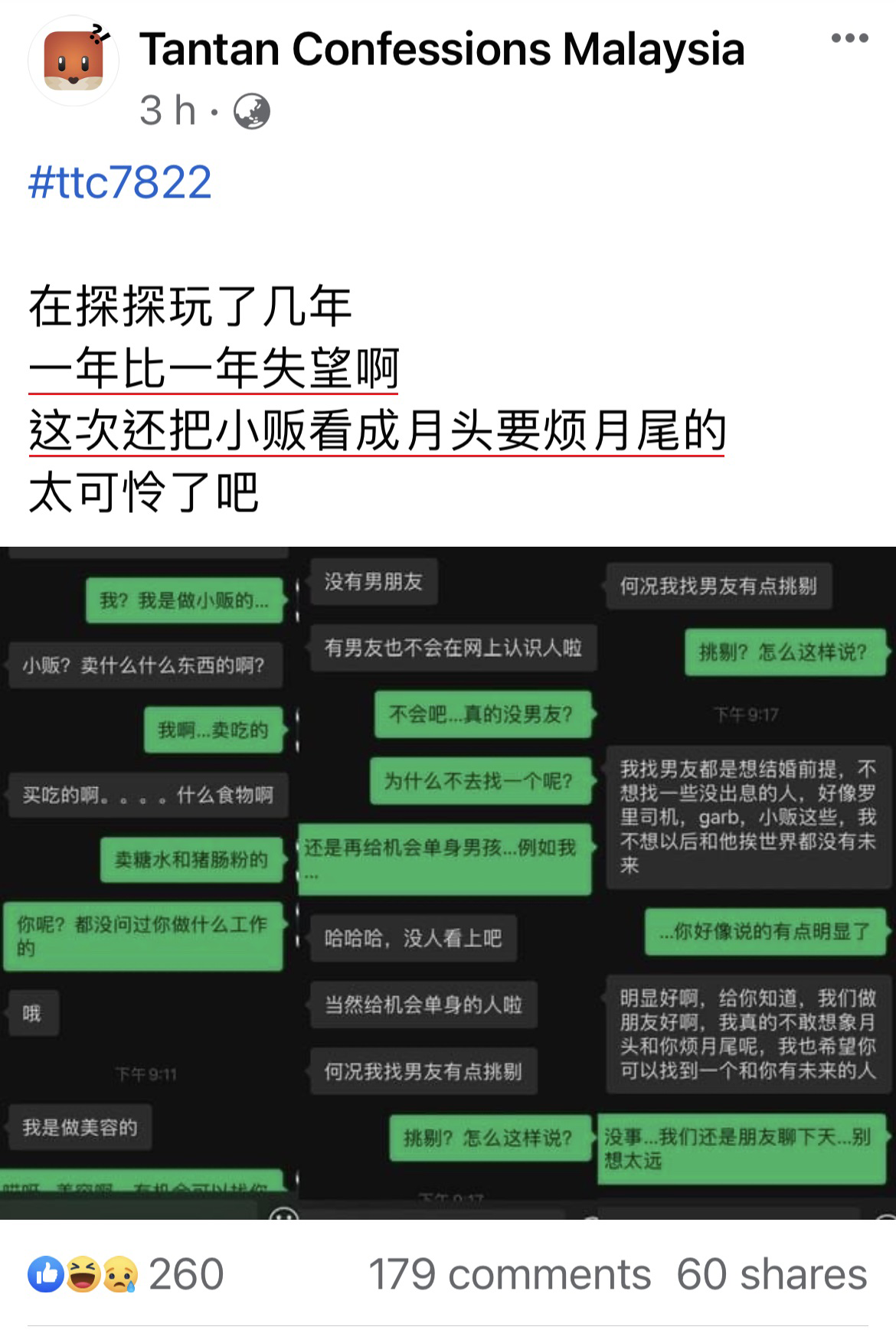 得知男方是一名小贩以后,女网友毫不掩饰地说,自己不想找“一些没有出息的人”做以结婚为前提的交往对象,还列出了所谓“没有出息的”就是这三种职业:罗里司机、电召车司机以及小贩。这下子男事主就明白了….