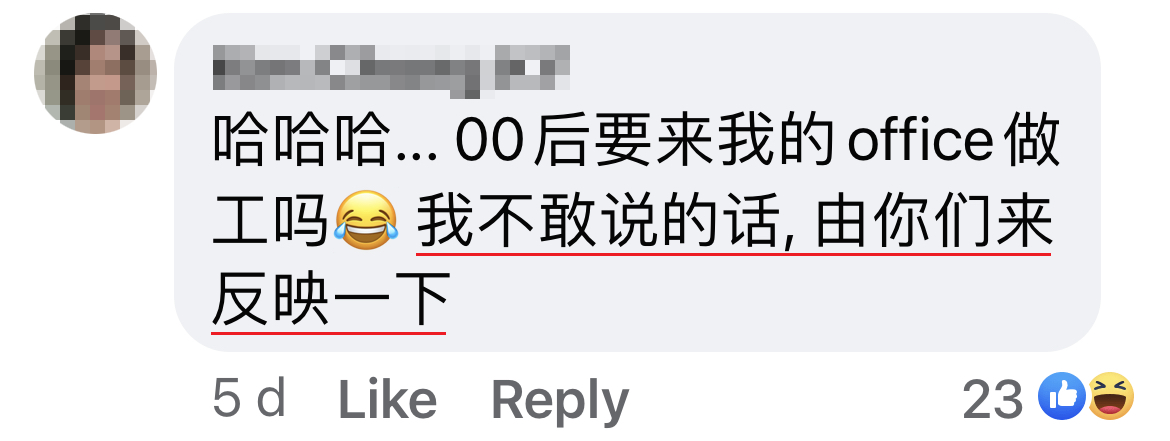第一位00后:其实很好相处,热情大方,但是她真的太过有话直说,时常吓得我们为她捏一把冷汗。比如说她做工做到很累了,就会直接说:「很想快点下班叻,我顶不顺了。」说得很大声那种,主管只坐在附近。或者说:「我可以不要做吗?呜呜呜~」,虽然她还是会乖乖做,但是这种话说出来也消极得太明显了吧!
