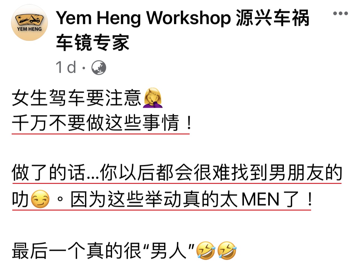 大马脸书专页“源兴车祸车镜专家”近日PO文列出6种大马女生驾车的Pattern,小心这些行为会让妳注定没有男友!