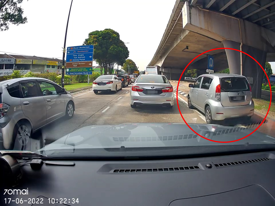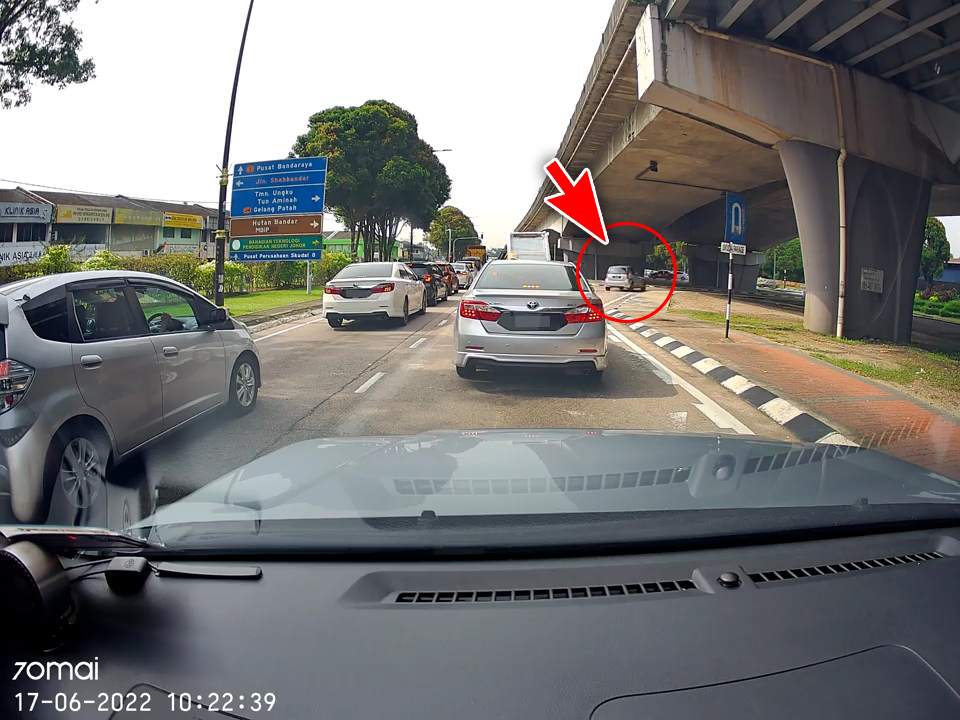 ▼ 当大家都在乖乖塞车的时候,旁边突然出现一辆银色 Myvi ,几乎整个车身都开上了人行道,非常顺畅地往前走,朝着U型转弯的方向“冲鸭”!