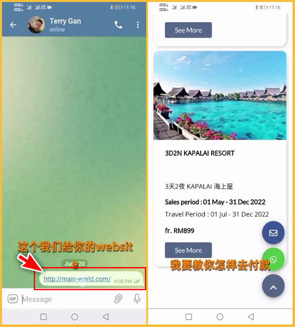 ▼ 自称是旅行社业者的华裔男子通过 Telegram 把链接发给该名友人,然后指示他点击链接进入他们的网站,并照着他们所讲的步骤支付订金。