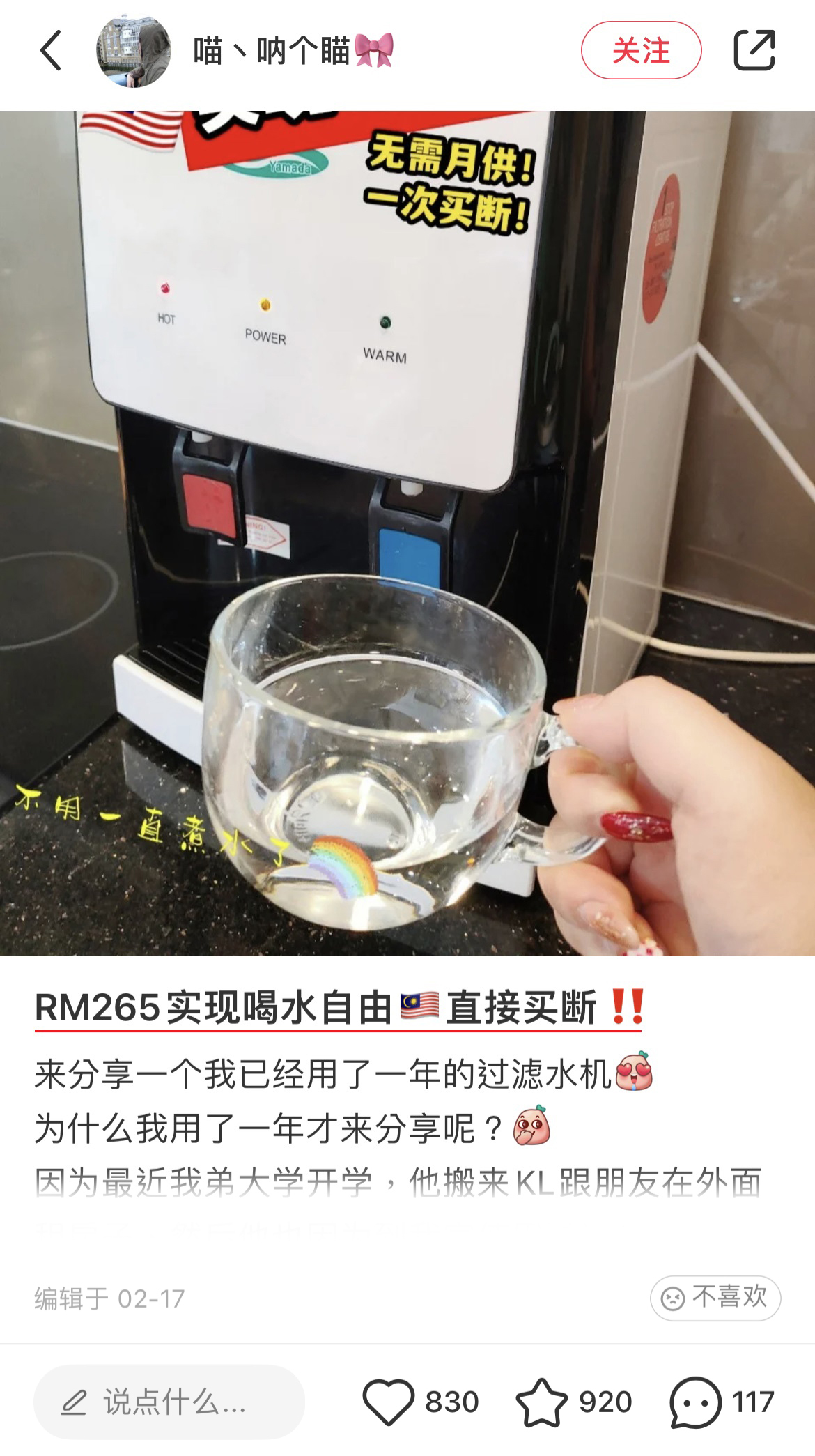 大马一名小红书博主推荐一款平价又好用的过滤饮水机,不到RM300就能入手!用了1年还是这么爱它!