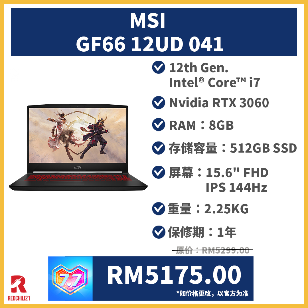 ▪ ⑥ MSI Gaming Laptop GF66 12UD 041 游戏笔记本电脑