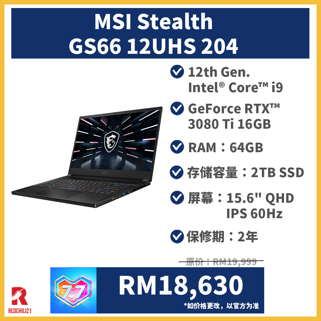 ▪ ⑦ MSI Stealth GS66 12UHS 204 游戏笔记本电脑