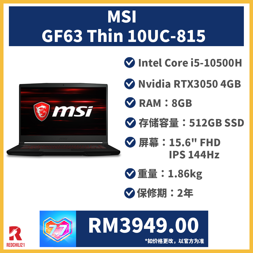▪ ⑤ MSI GF63 Thin 10UC-815 游戏笔记本电脑