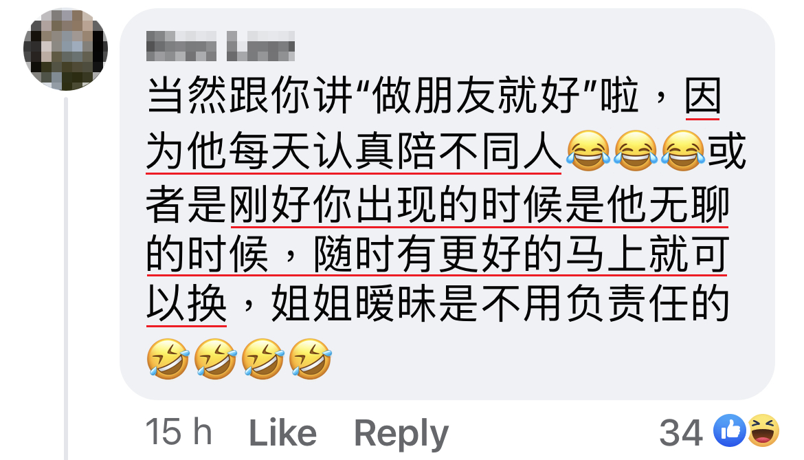 一名27岁大马女生匿名PO文,声称自己正在和一位40岁大叔暧昧不清,她列出其中10个大叔对她的日常贴心举动,虽然大叔说“做朋友就好”但又似乎不止是朋友?
