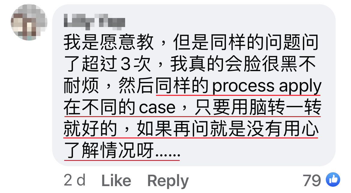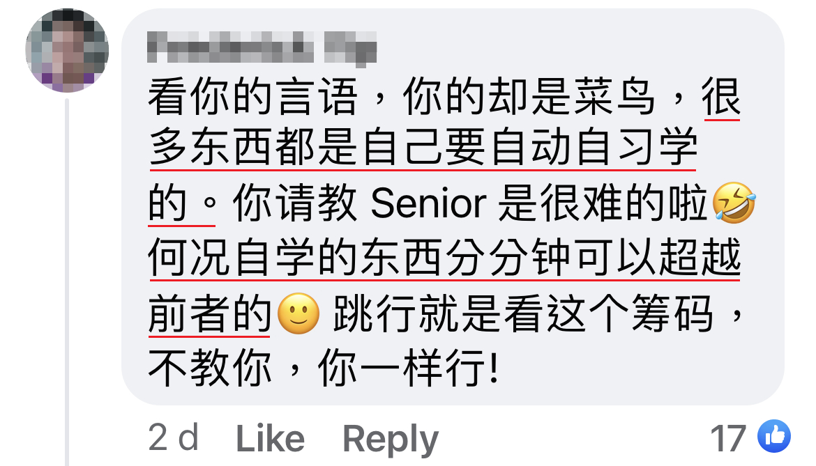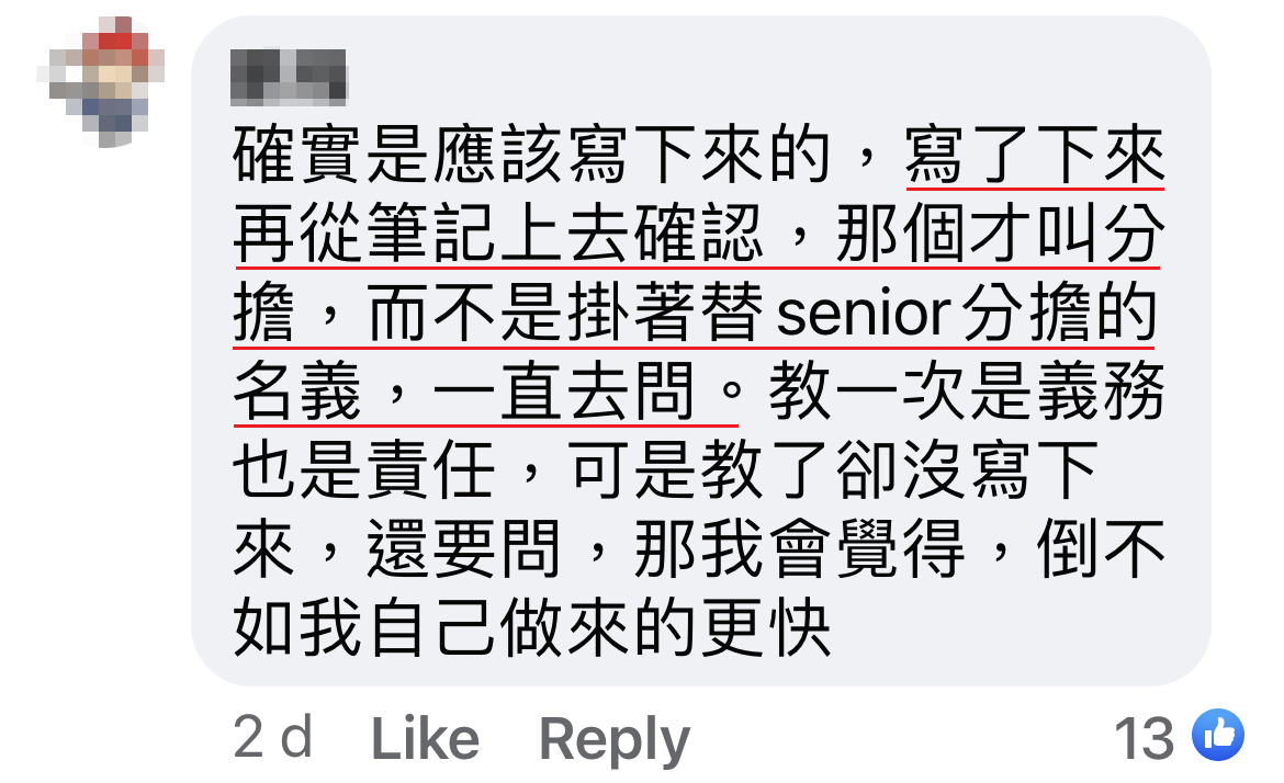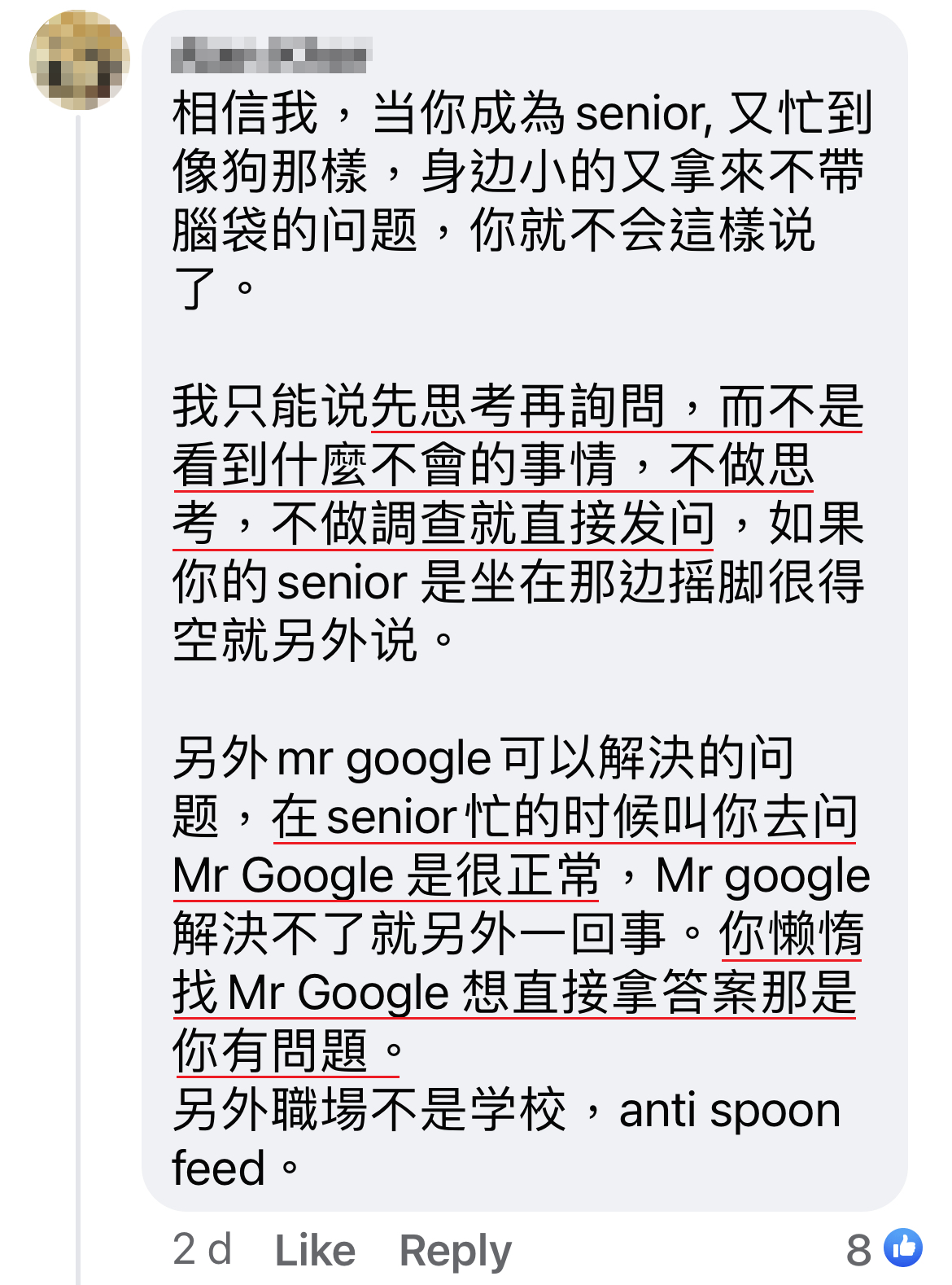 2. 我不是问一些 Google 都能回答的蠢问题,而是必须由 senior 来指导的哦,教我也只是帮他自己分担工作罢了,是在脸黑什么?