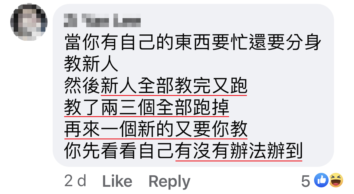 3. 直接在附近跟别的同事说:「新人的quality好像不太行。」好像说得小声,其实根本就是大声到可以让我听到。
