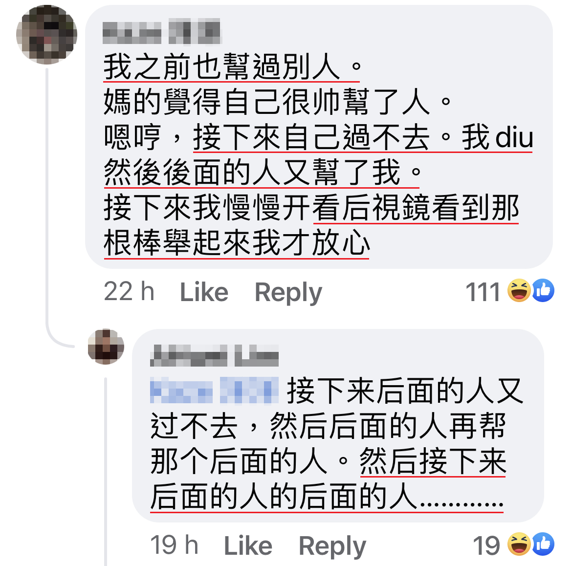 ▼ 就在这个时候救星来了!后方被卡住的其中一辆轿车 Perodua Kenari,车主 Aunty 看不下去直接拿着自己的 TNG 卡下车,走到豪车旁边帮他“滴”!