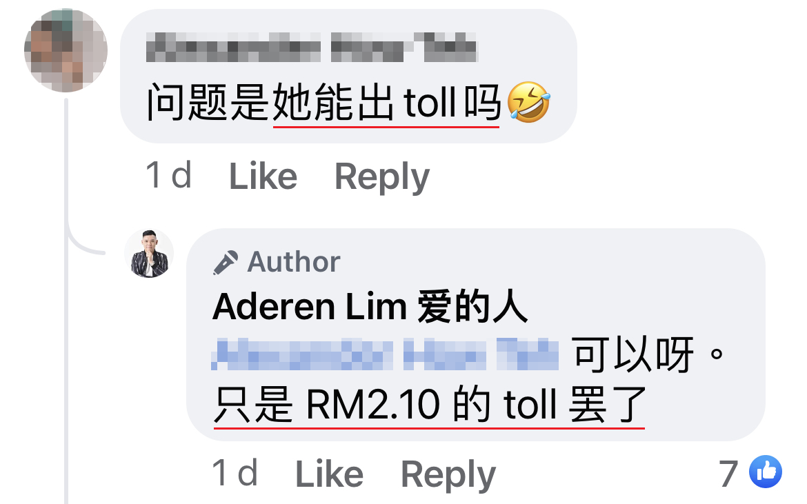 ▼ Aunty帮FK8付了RM2.10的“Toll钱”。