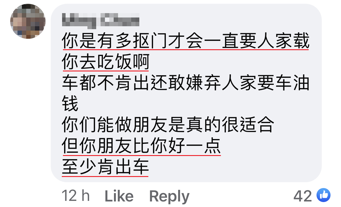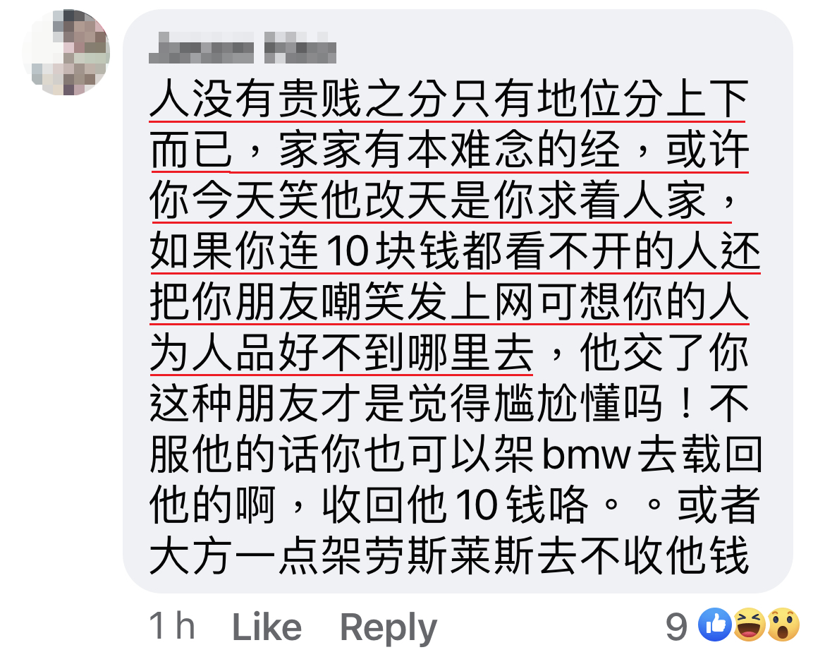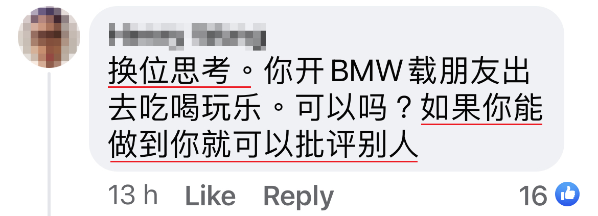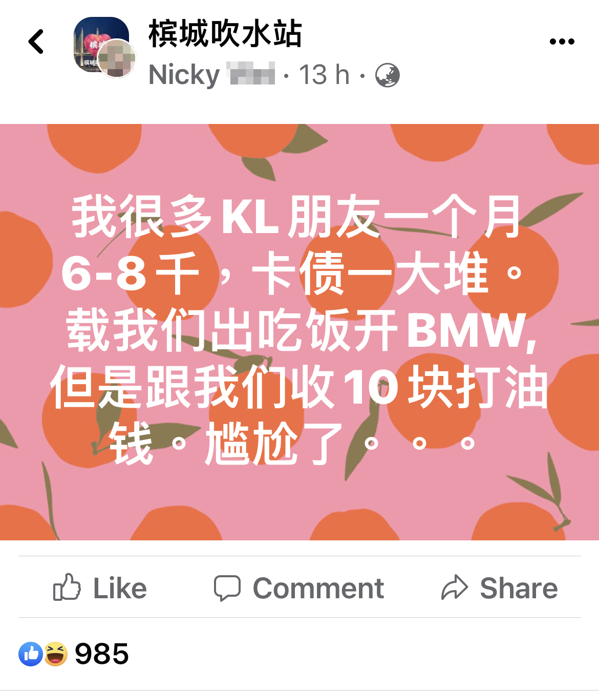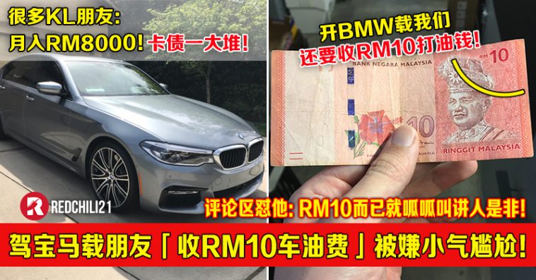 不过一名大马男子近日就在脸书发文,吐槽身边很多来自吉隆坡的朋友外表光鲜亮丽但欠债累累。开宝马(BMW)豪车载他们一群朋友去吃饭,随后就向他们收取RM10车油费,他直呼:太尴尬了!