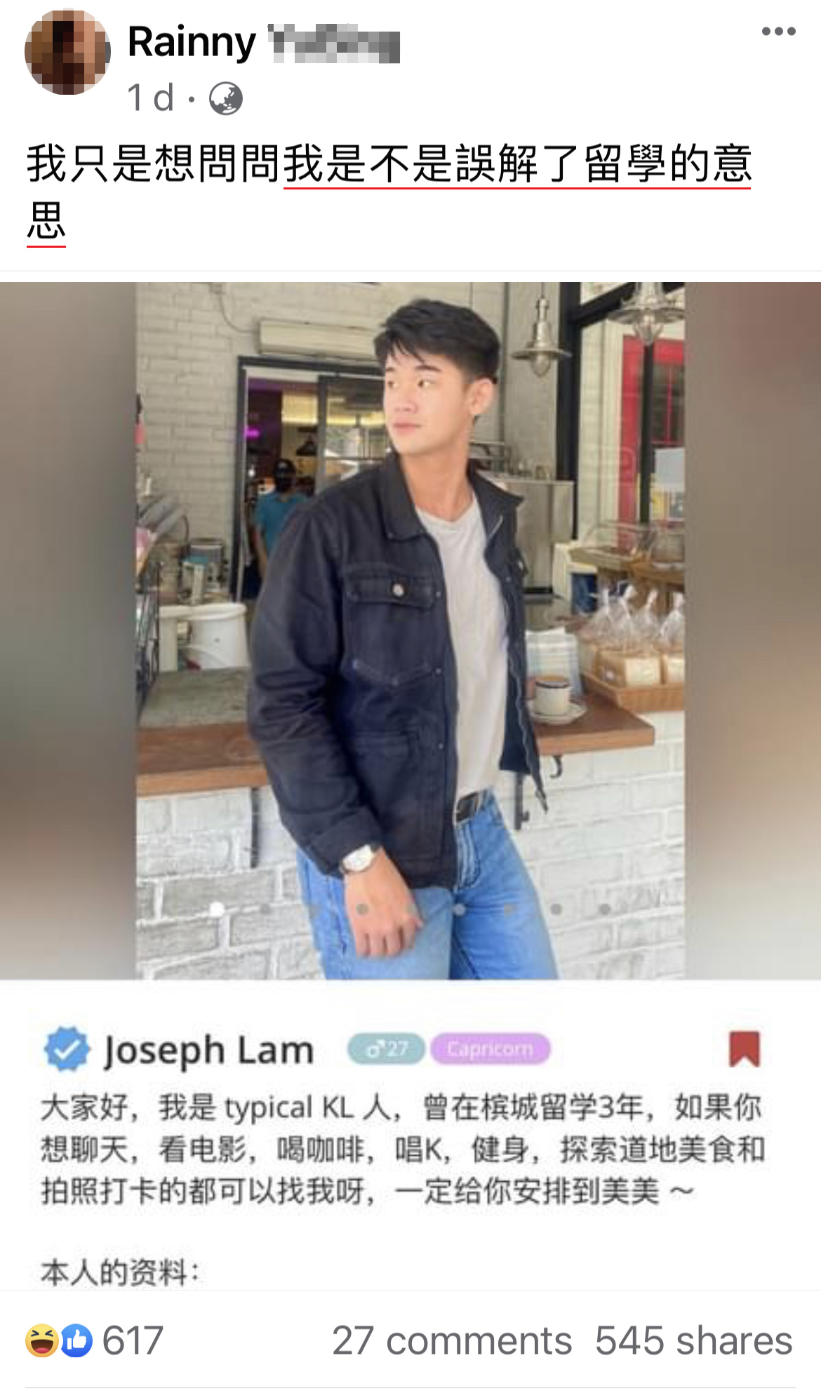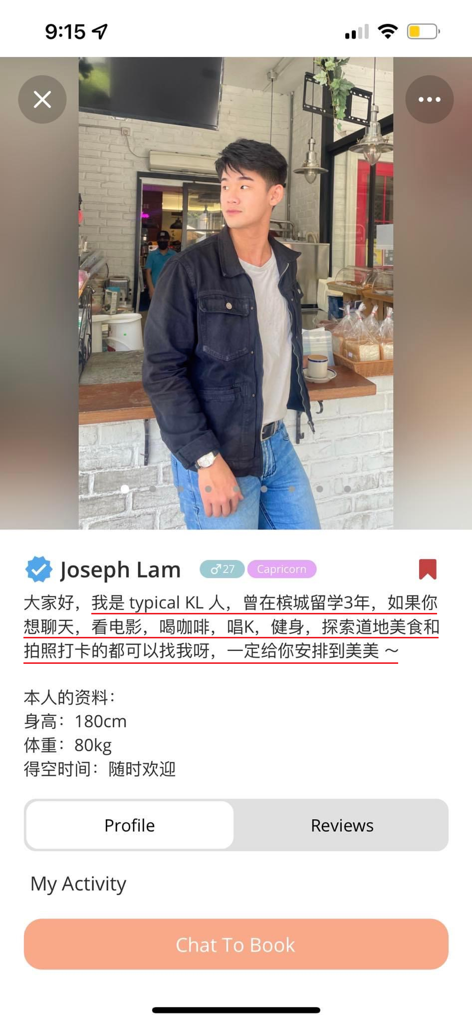 在“出租朋友”的 APP 上有一位名为 Joseph 的用户,他的简介内容因为过于“突出”而瞬间火了起来!大马网民看了以后都一脸懵:原来去槟城就是出国了?