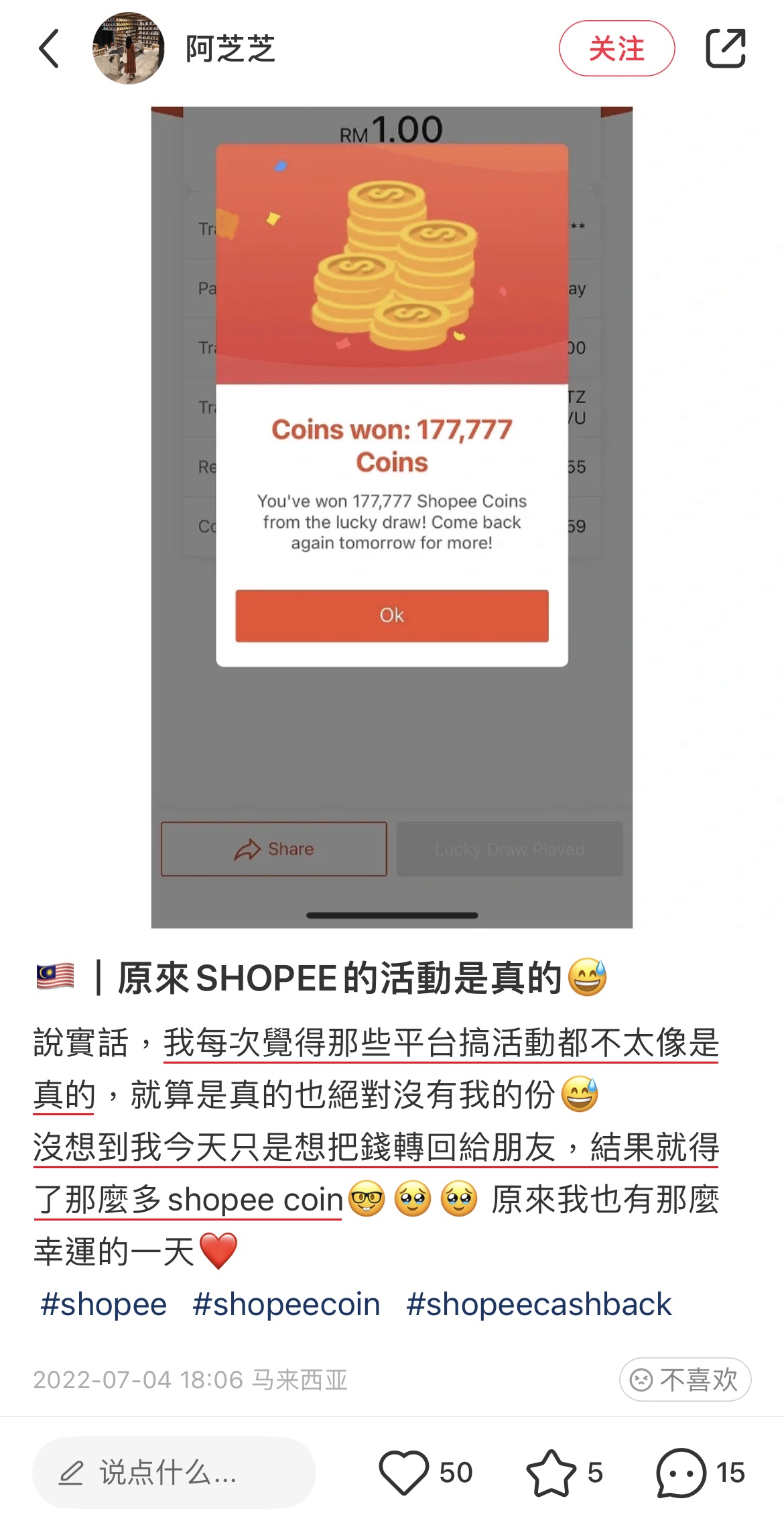 近期 Shopee 又有一项抽奖活动,用户只要转账最低RM1就获得一次抽奖机会,而最高可赢取的金额多达177,777 Shopee Coins 也就是现金 RM1,777.77。