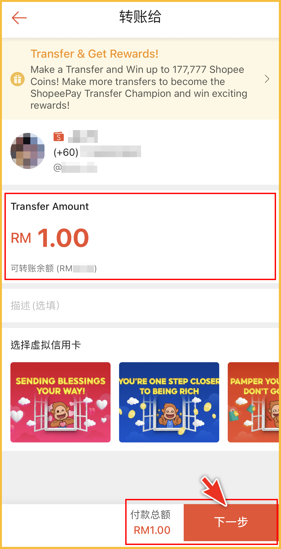 ▼ Step 4:选择要转账的联系人以后,输入转账金额并点击“下一步”。