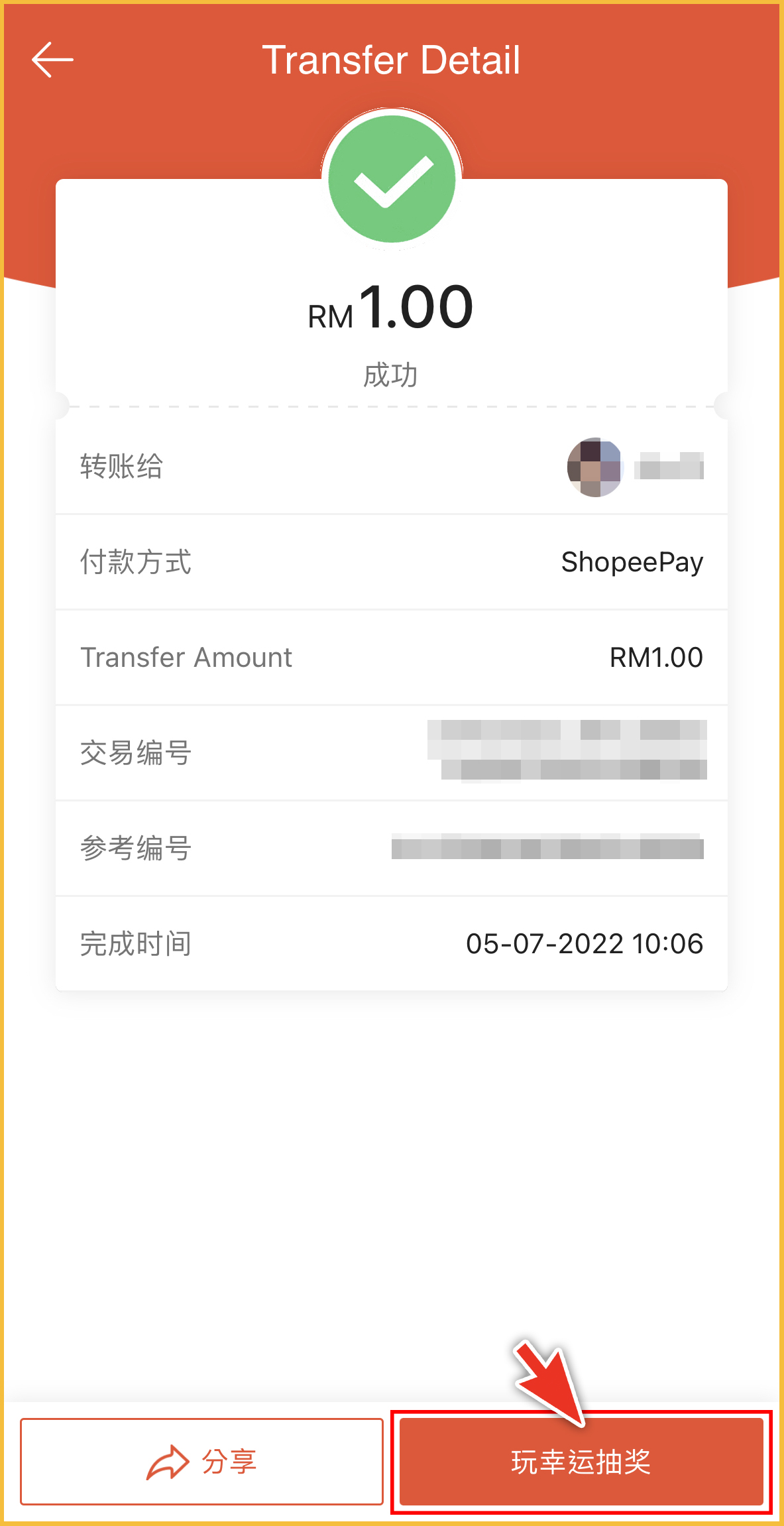 ▼ Step 6:转账成功以后,点击右下角的“玩幸运抽奖”。