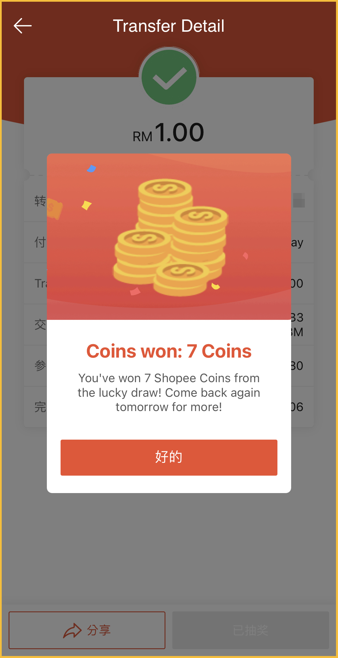 ▼ 最后就是看你的运气啦~(小编只拿到7个 Shopee Coins…. )