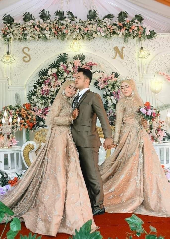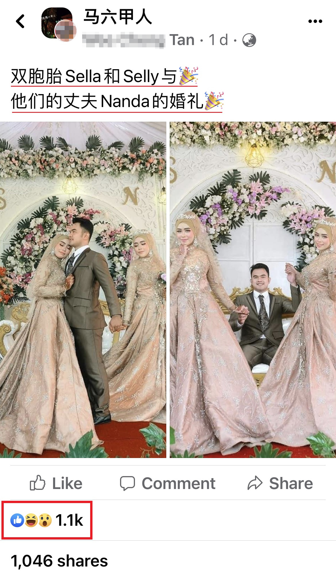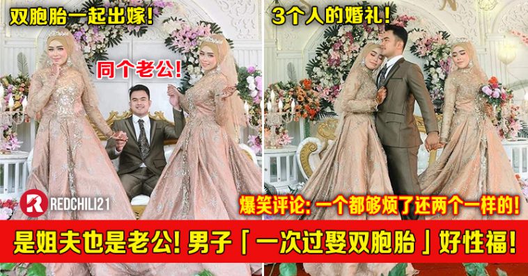 但一场婚礼同时迎娶双胞胎姐妹还是头一次见!大马网民在“马六甲人”脸书群上传2张结婚照,双胞胎姐妹一起结婚,是同一位老公哦!