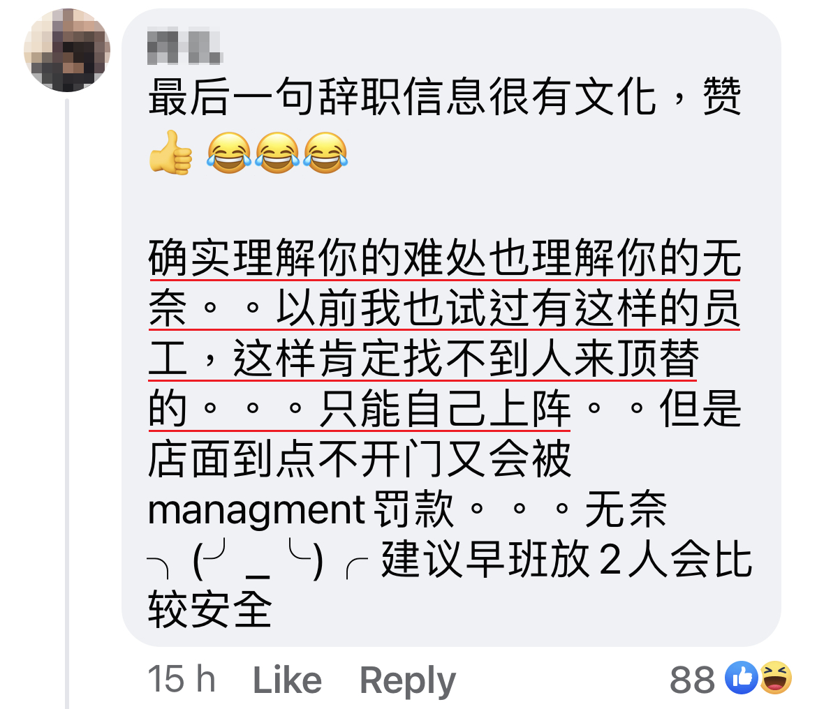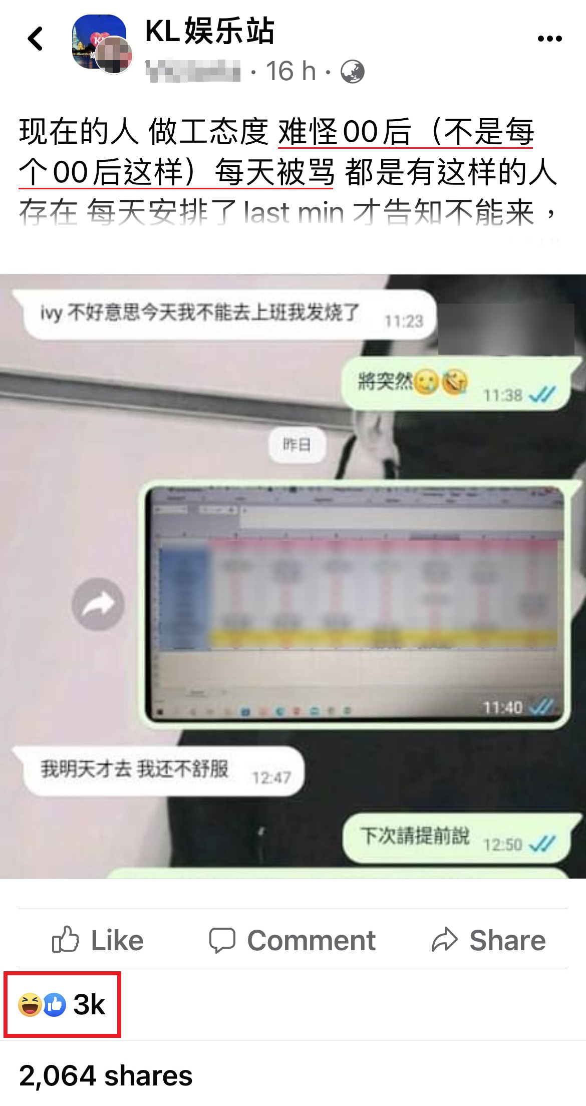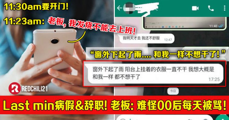 昨天一名大马老板 beh tahan 在脸书吐槽,“衰衰”遇到工作态度极差的00后员工上班的前3分钟才说要请病假,最后的辞职通知老板看到都懵了!