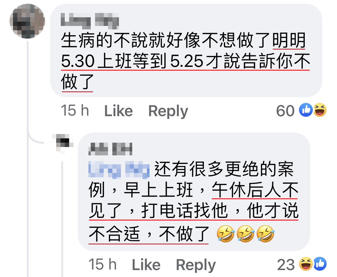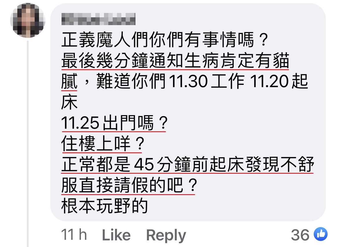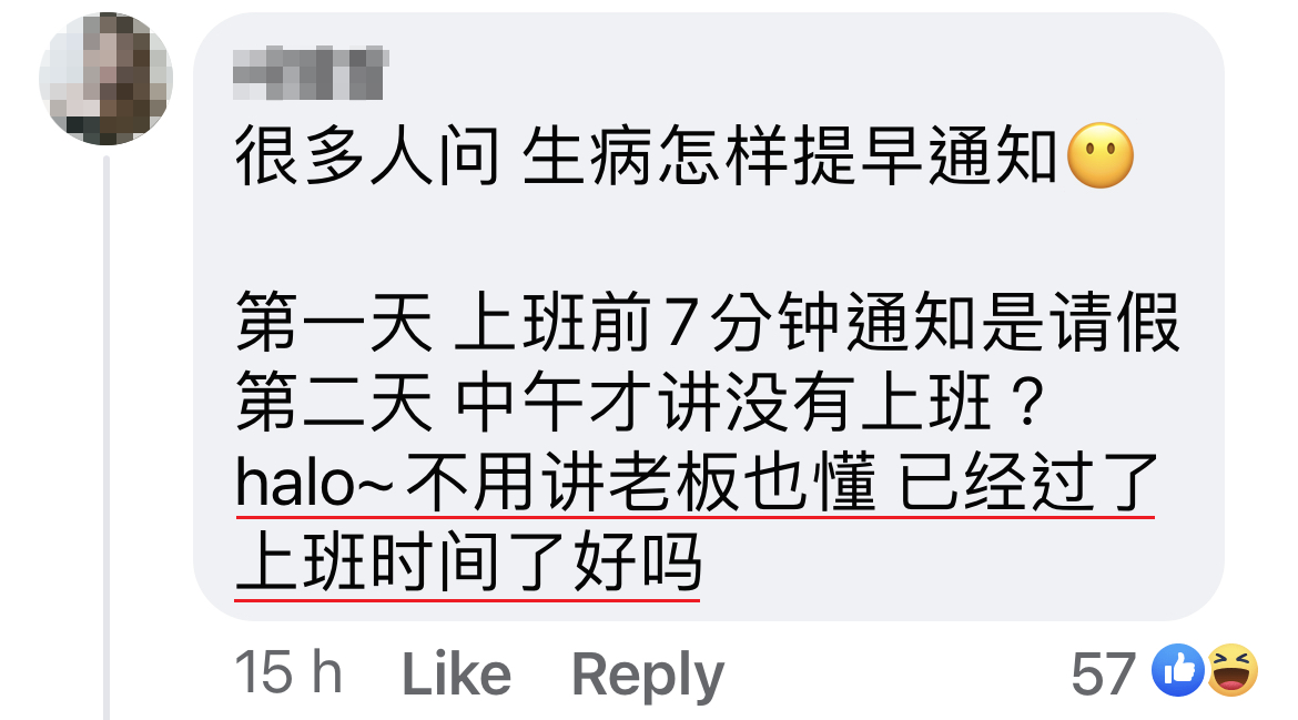太多人评论:「难道生病可以提前知道?」我没说生病可以提前知道,可是11:30am开门11:23am告知请假,7分钟怎么找人顶替?提前一小时都容易找人帮忙啊!