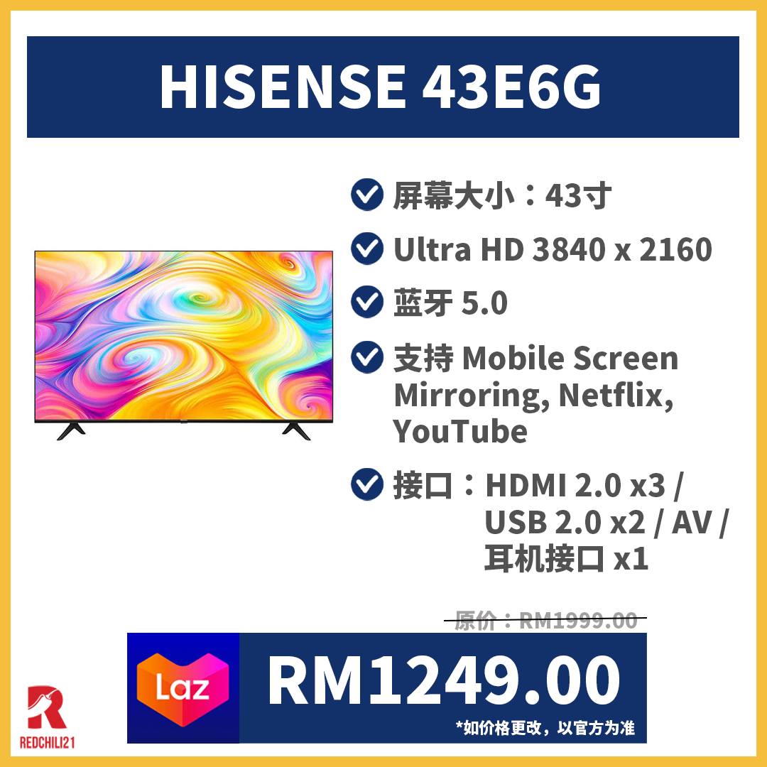 ▪ ⑧ Hisense 43E6G 43″ 4K UHD 智能电视