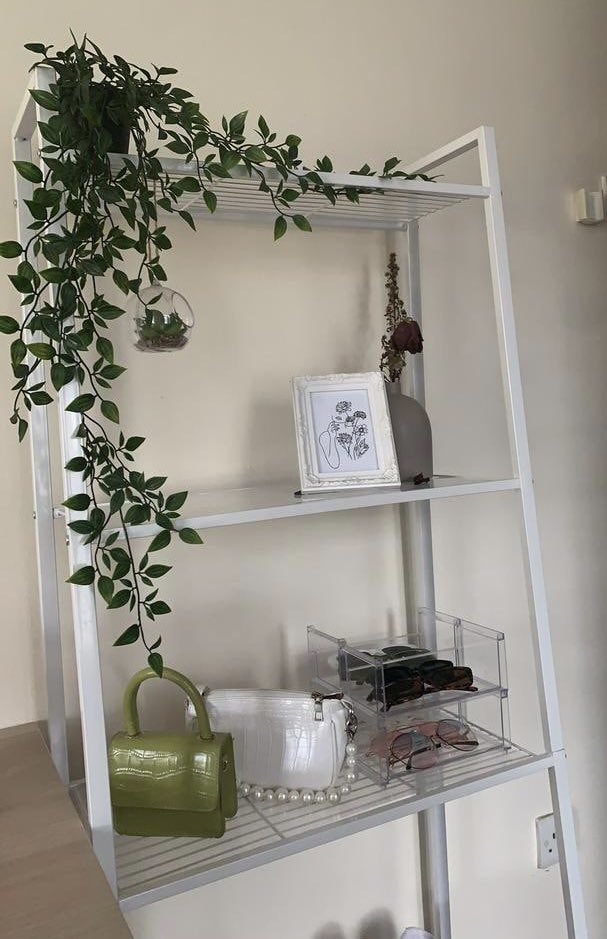 「书本、包包、小花瓶都可以摆放在这个置物架上。」
