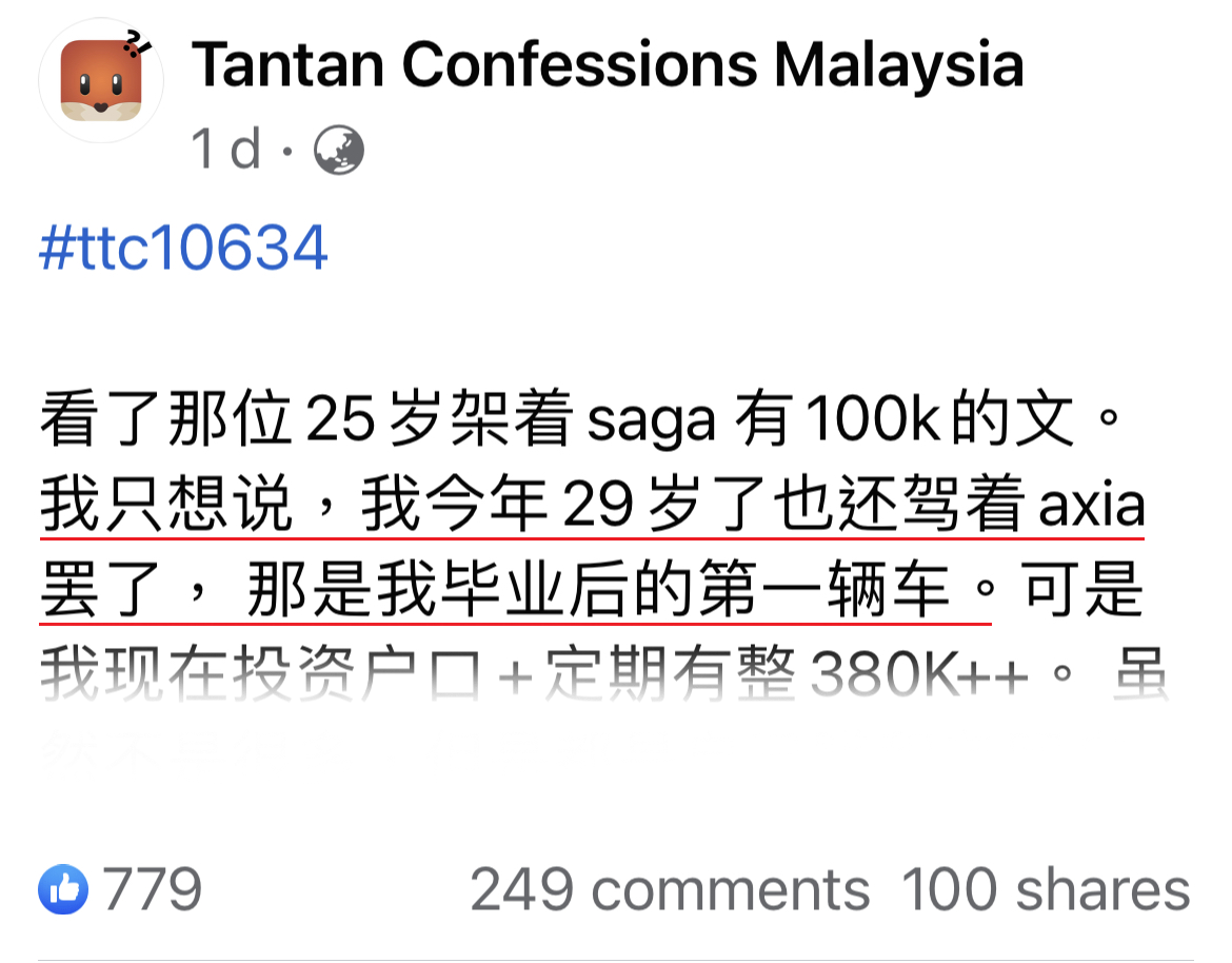 看了那位25岁驾着 Saga 有RM100k的文。我只想说,我今年29岁了也还驾着Axia罢了,那是我毕业后的第一辆车。可是我现在投资户口+定期有整RM380K++。