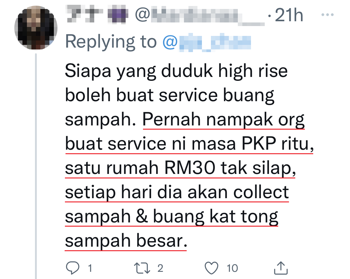 「之前MCO期间,看过有人提供丢垃圾服务,一户收费RM30,每次就去收集垃圾然后帮忙丢到大垃圾桶。」